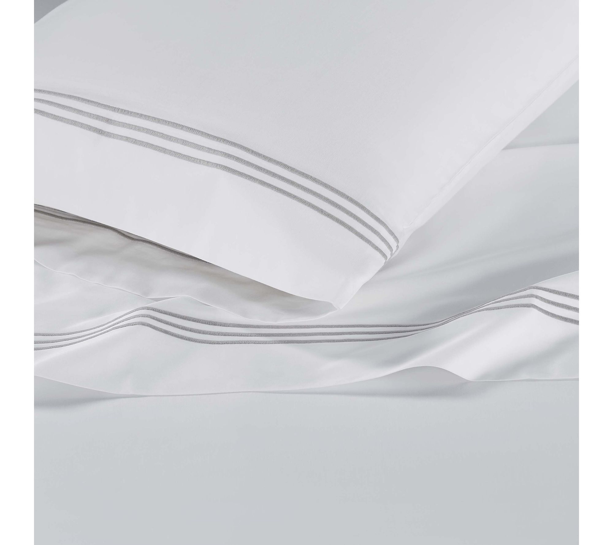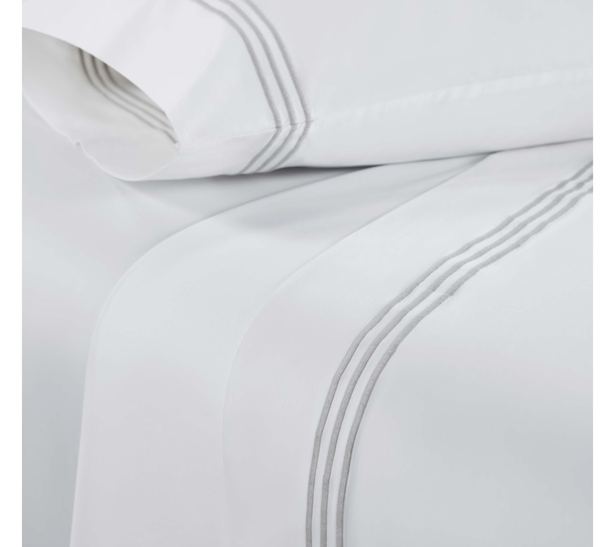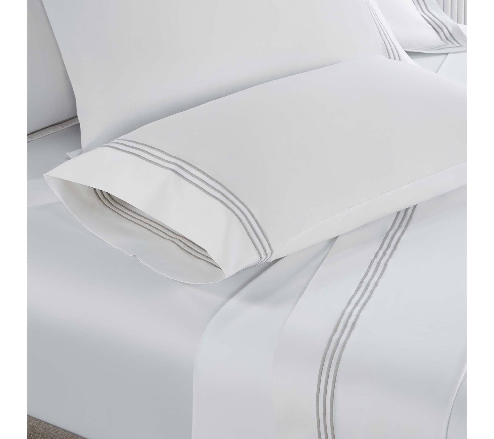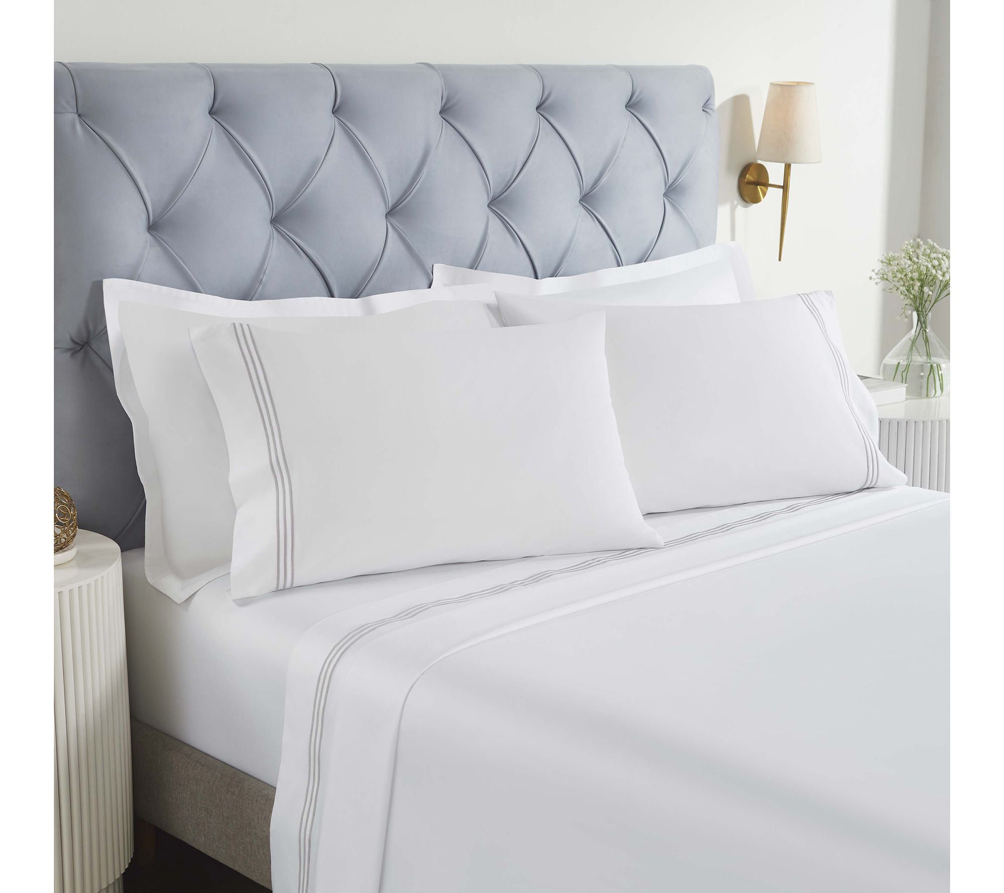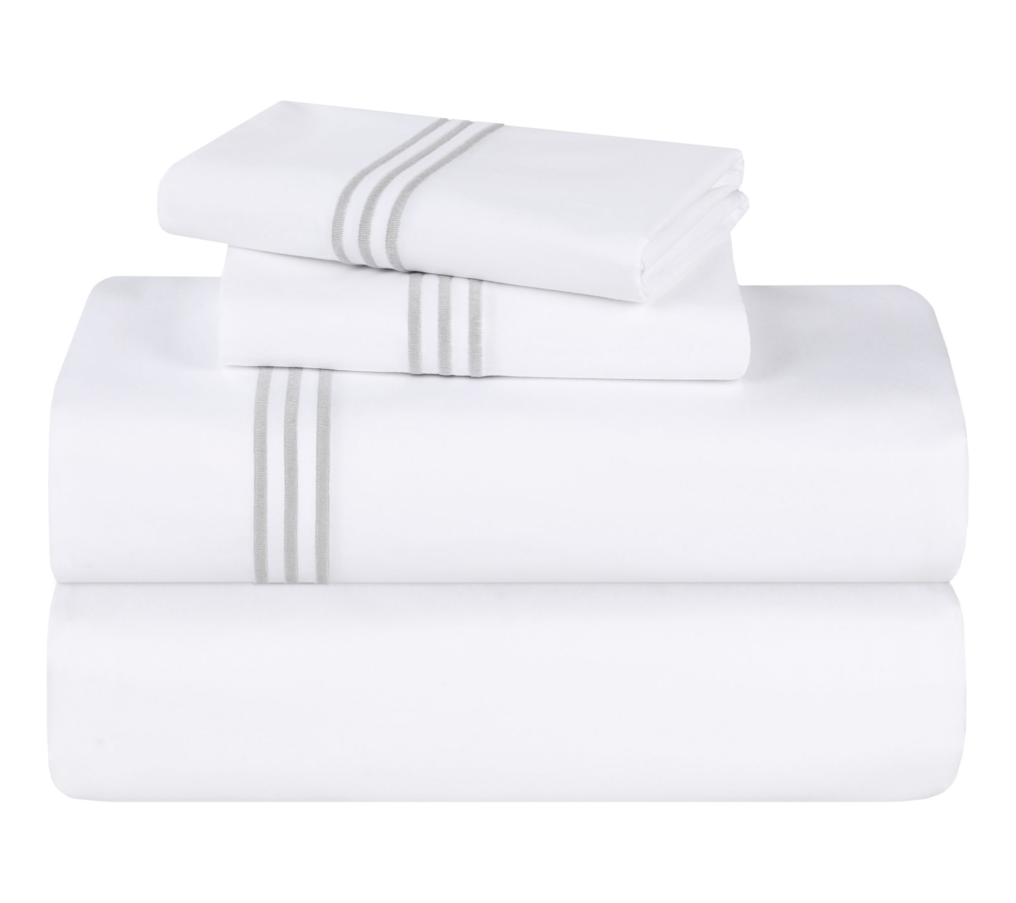 Bring a touch of elegance to your bedroom with this Superior Chain Links Cotton Embroidered Bed Sheet Set. Designed for comfort, this set showcases a subtle shimmer from its sateen weave finish and intricate two-lined silver-colored embroidery, blending traditional and modern styles effortlessly. From Superior.