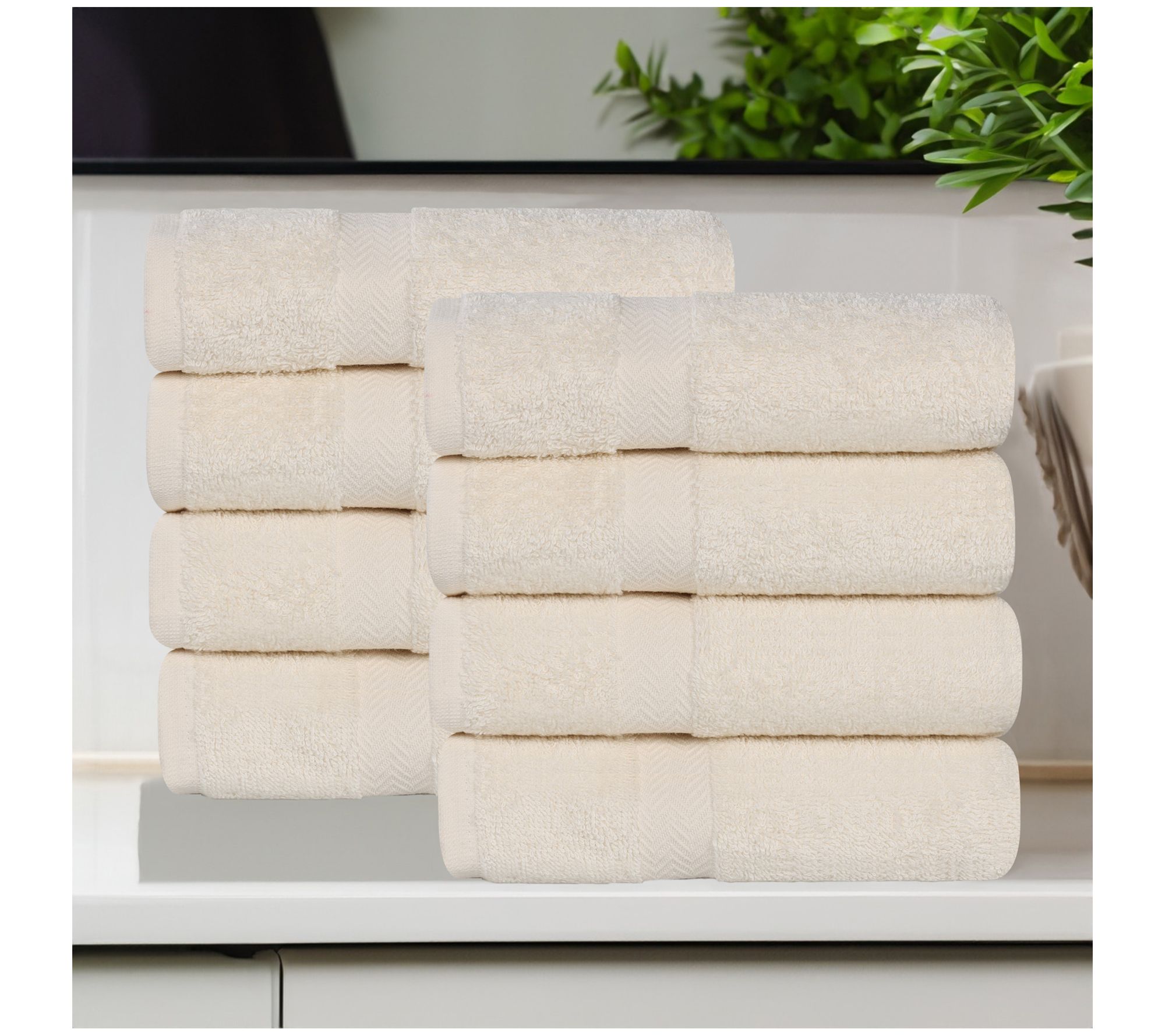 Add a chic update to your bath with these eight absorbent, comfy cotton hand towels. A thick border and striking chevron pattern bring a fresh look to your space. From Superior.