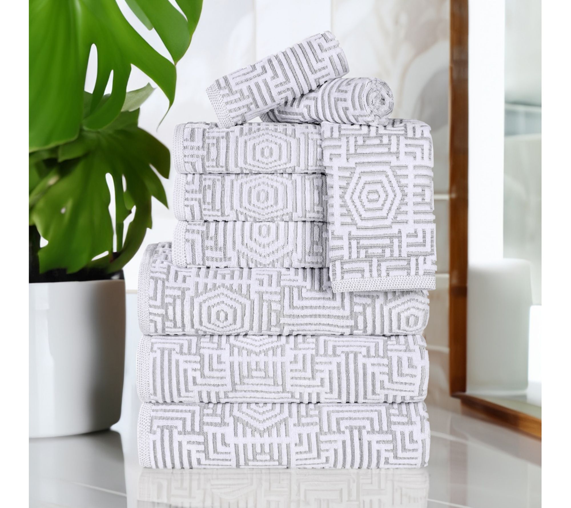 Transform your bathroom into a sanctuary of comfort and style with the Modern Geometric Jacquard cotton towel set. These towels, crafted from 100% Cotton, offer a luxurious softness and superior absorbency, adorned with a unique geometric jacquard design that complements any bathroom decor. From the guest bath to the master suite, this set brings a touch of elegance and practicality to your space. From Superior.