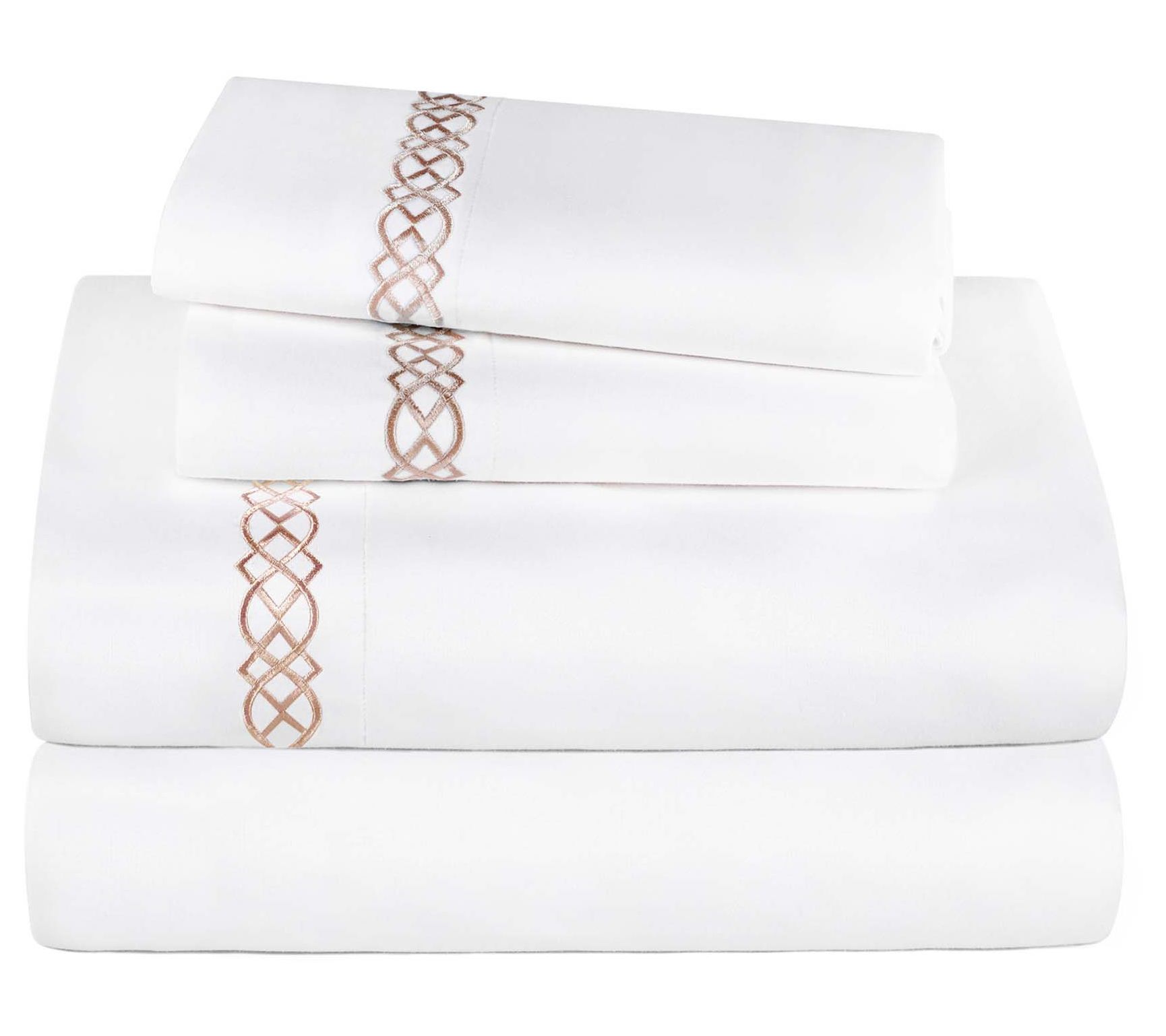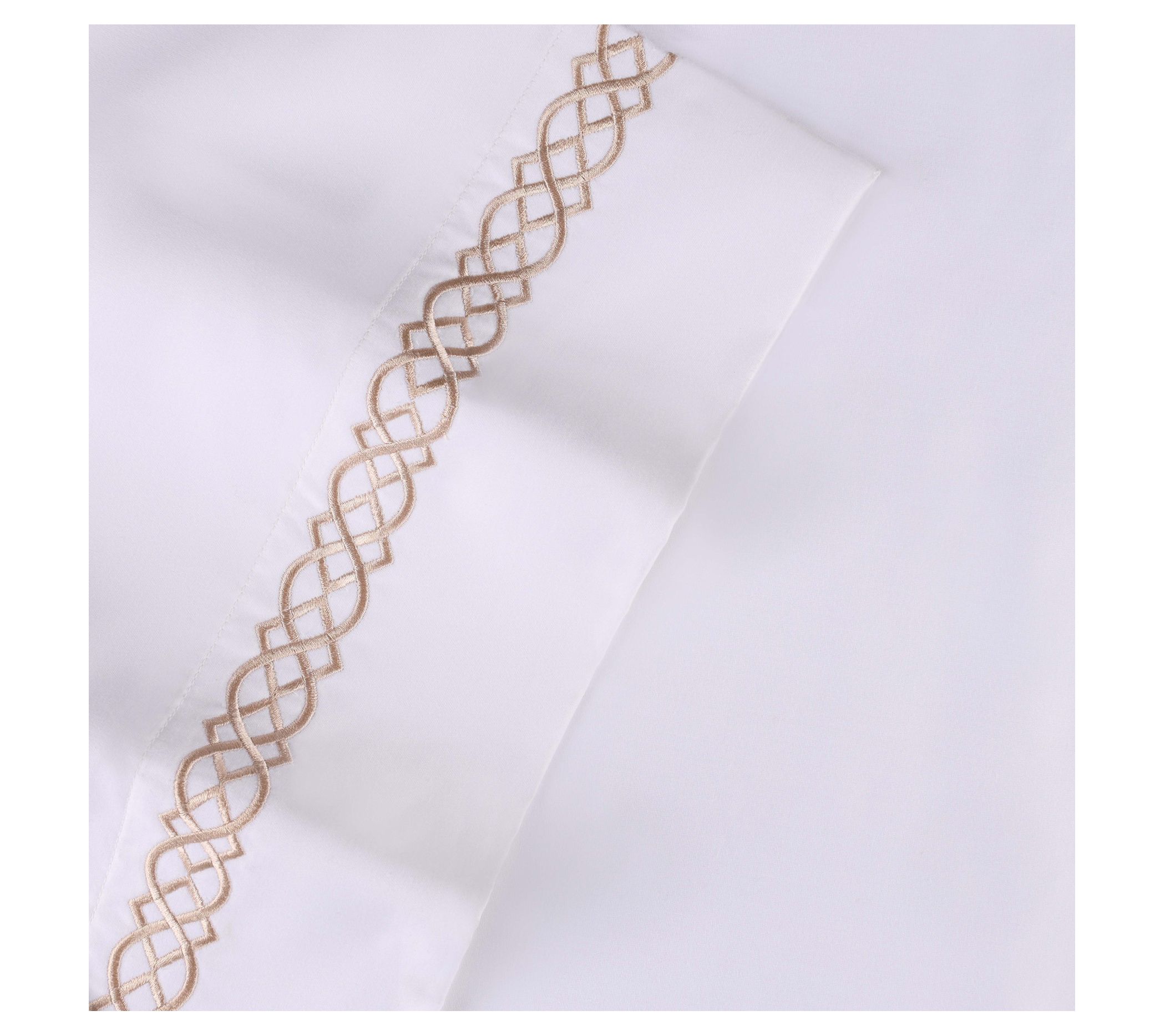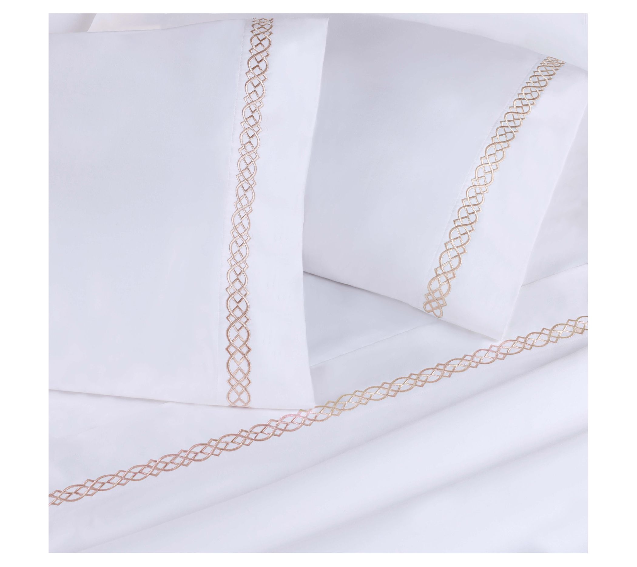 Indulge in the incredible comfort of the Egyptian Cotton 1000 Thread Count Embroidered Bed Sheet Set. Made from soft and breathable 100% Egyptian Cotton, this versatile set includes a flat sheet, fitted sheet, and two pillowcases. The fully elasticized fitted sheet features deep pockets designed to fit oversized mattresses up to 18". The flat sheet and pillowcases showcase a stylish infinity scroll embroidery. From Superior.