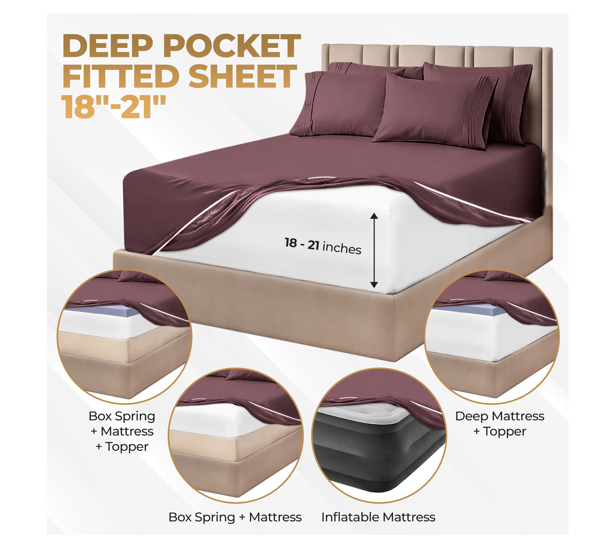 • Queen sized: Flat sheet 102" x 90"; Fitted sheet 80" x 60" x 21" pocket depth; Pillowcase 20" x 30"
