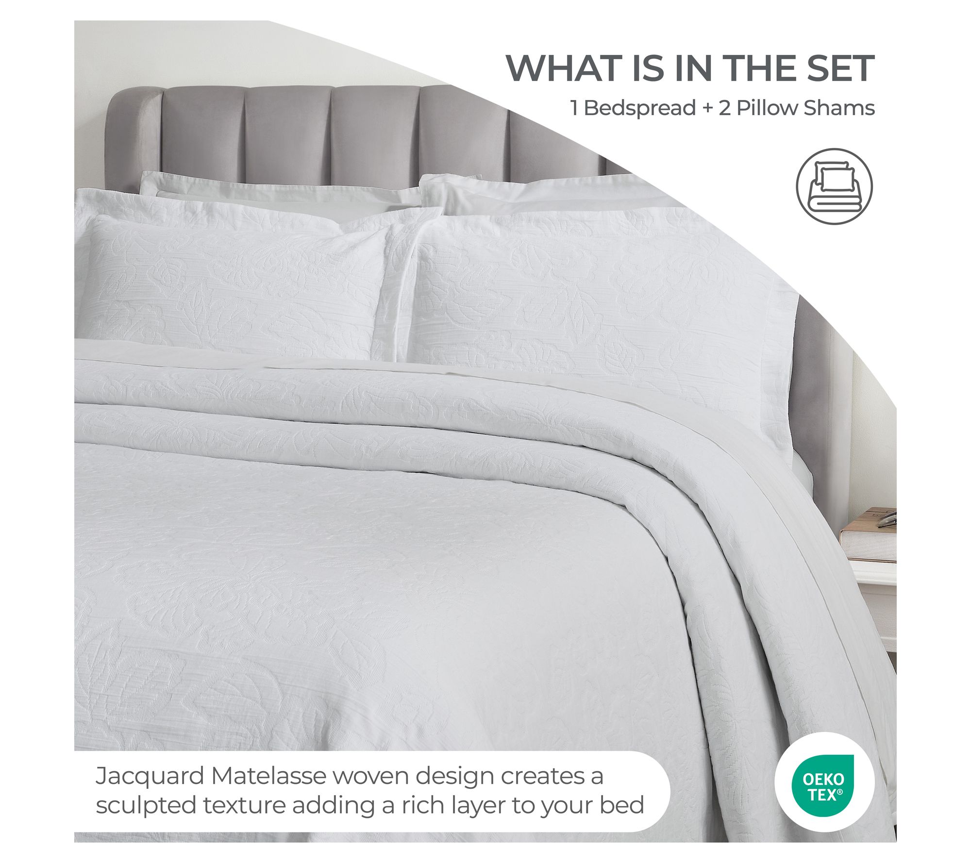 Transform your bedroom into a tropical haven with this Superior Hibiscus cotton bedspread and sham set. The dual-tone floral design paired with the raised jacquard matelasse texture adds a touch of elegance and sophistication to any decor. From Superior.