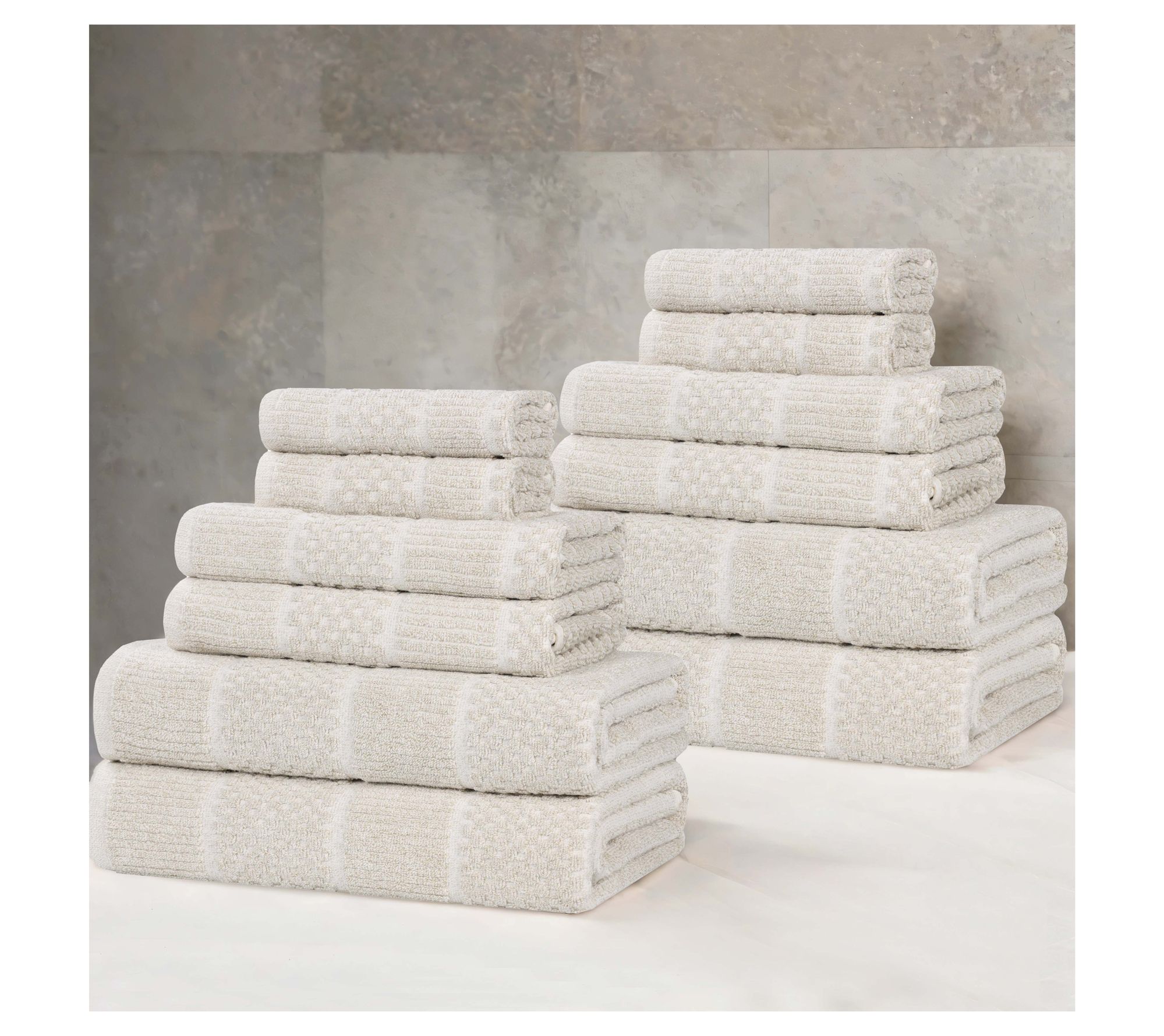 Refresh your bathroom with the Naples 12-piece cotton-blend towel set. The alternating checkered and ribbed design adds a stylish touch while balancing texture and pattern. Each towel comes with an attached hanging loop for easy storage. From Superior.