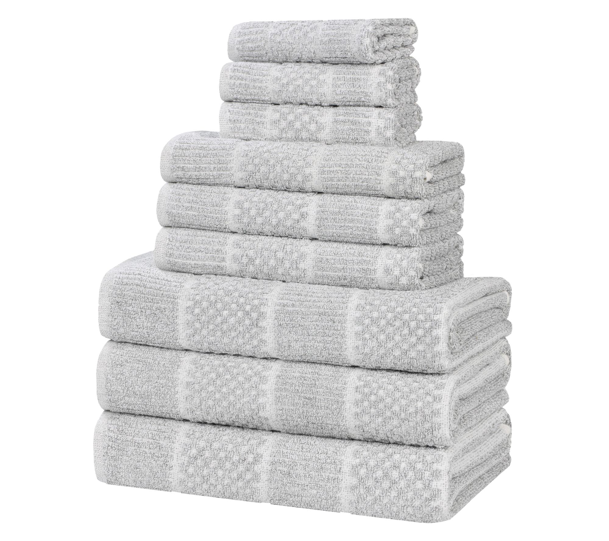 Update your bathroom with this versatile nine-piece towel set featuring a stylish alternating checkered and ribbed design. With soft and absorbent materials, these towels offer both chic aesthetic and practical use. From Superior.