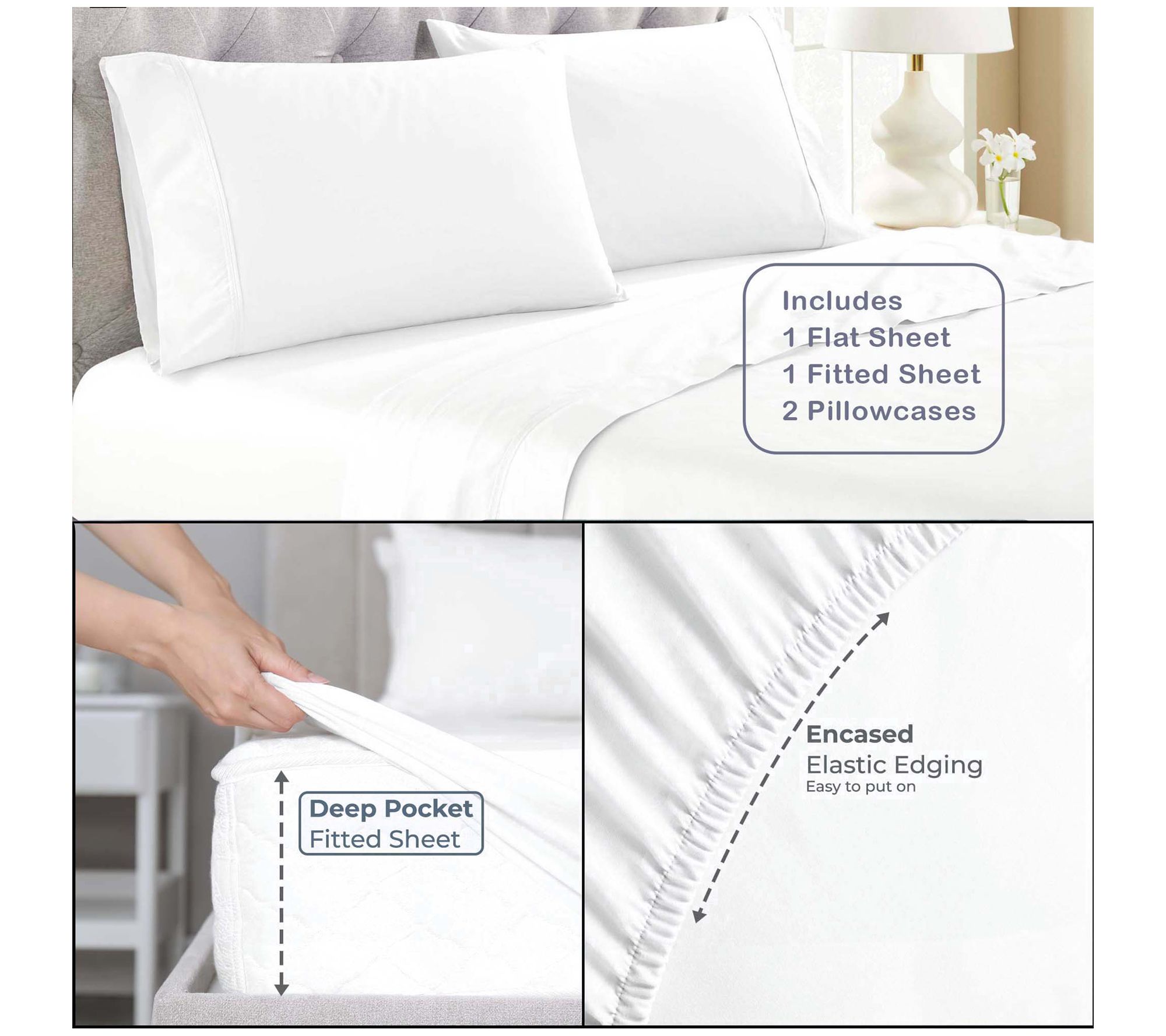 • Includes one flat sheet, one fitted sheet, and two standard pillowcases