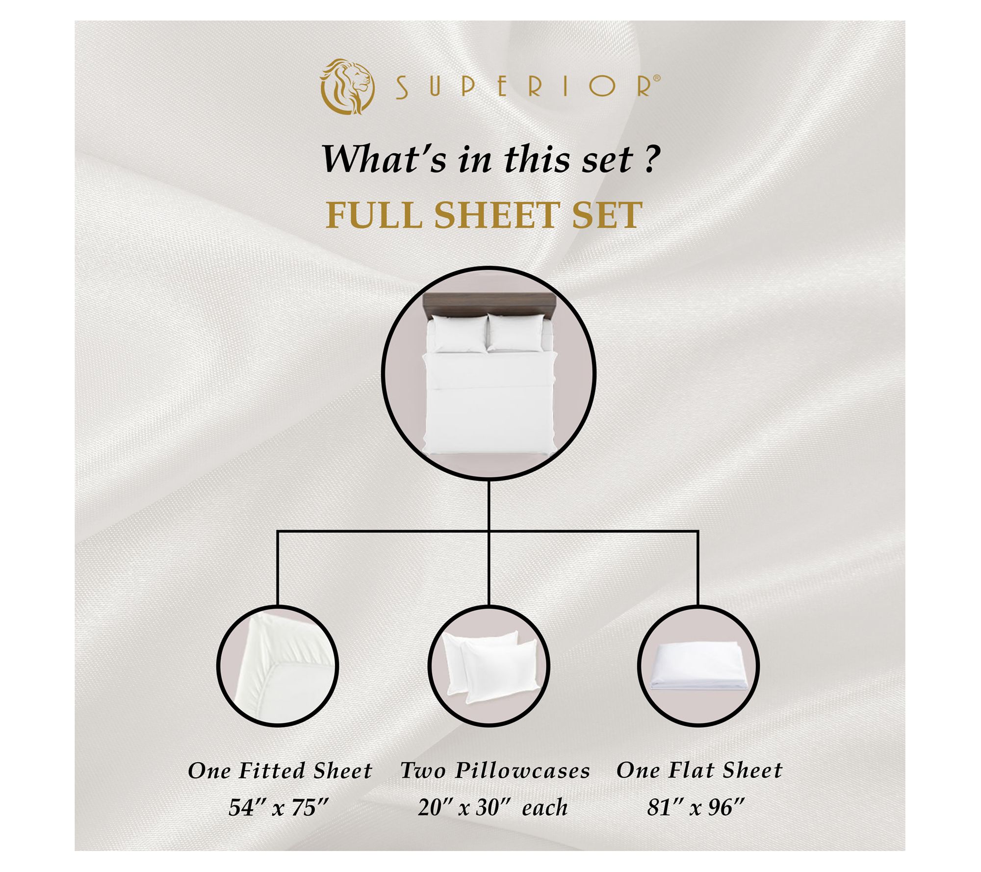 • Full sized: Flat sheet 81" x 96"; Fitted sheet 54" x 75" x 18" pocket depth; Pillowcase 20" x 30"