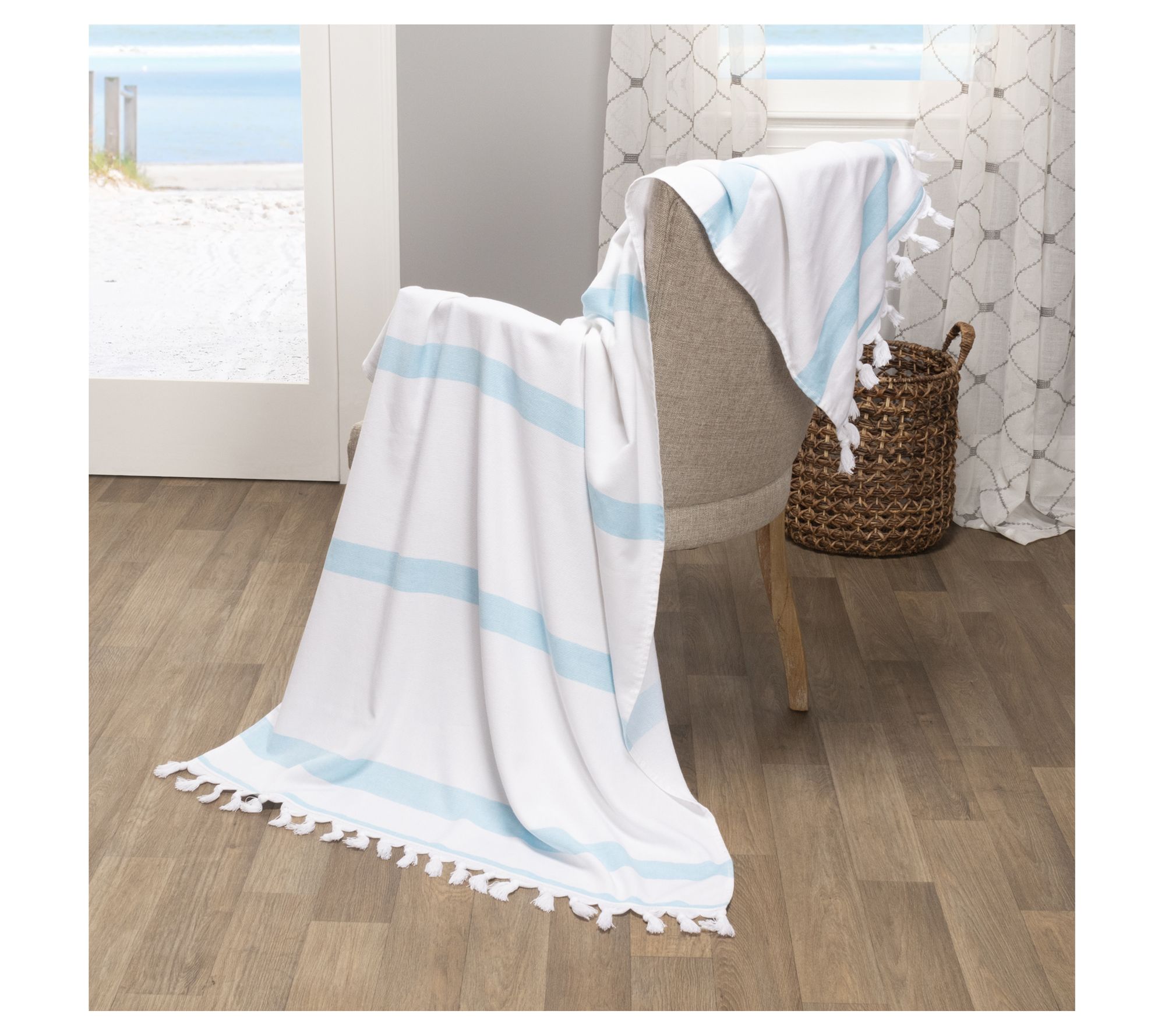 Make a splash this summer with the Tropical Cabana oversized beach towel. On one side, it features a woven texture that is soft to the touch with a fast-drying terry cotton construction on the other side. From Superior.