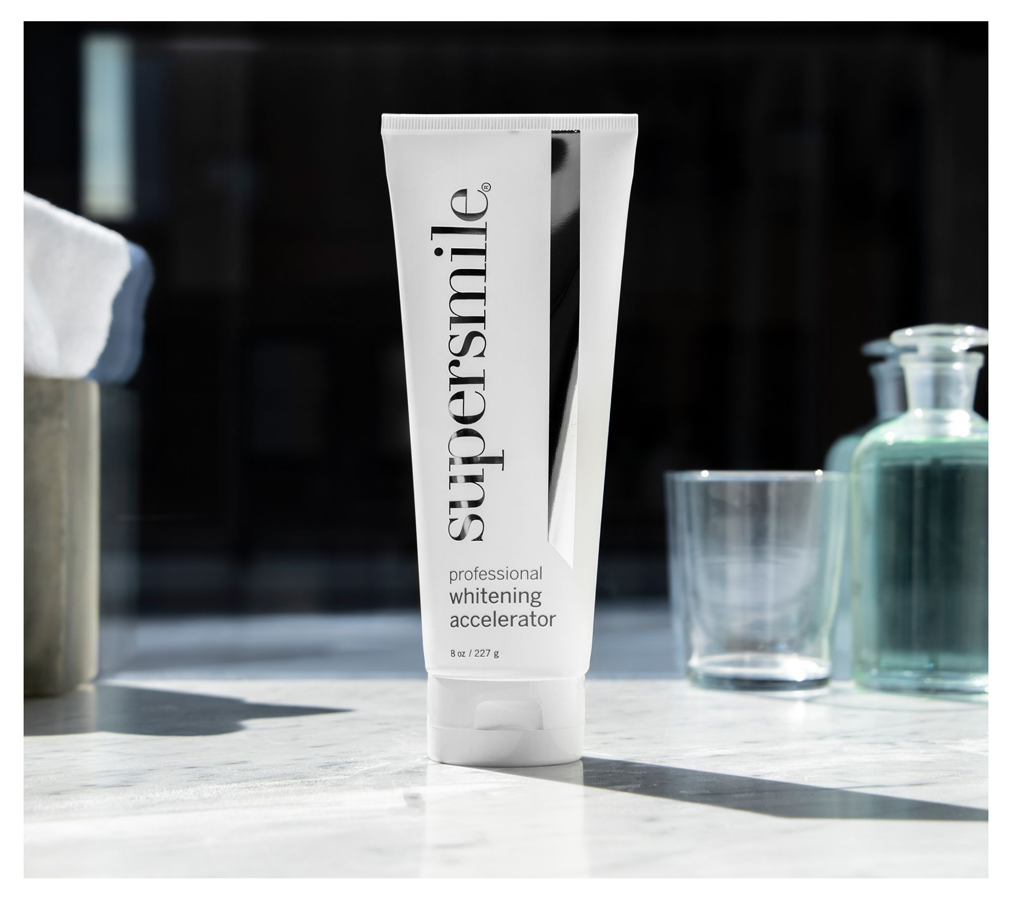 When paired with Supersmile Whitening Toothpaste (not included) or other toothpastes, Supersmile Whitening Accelerator helps lift stains. The formula contains carbamide peroxide which is the base for most teeth whitening products. The accelerator helps teeth feel smooth and shiny with no gritty residue.