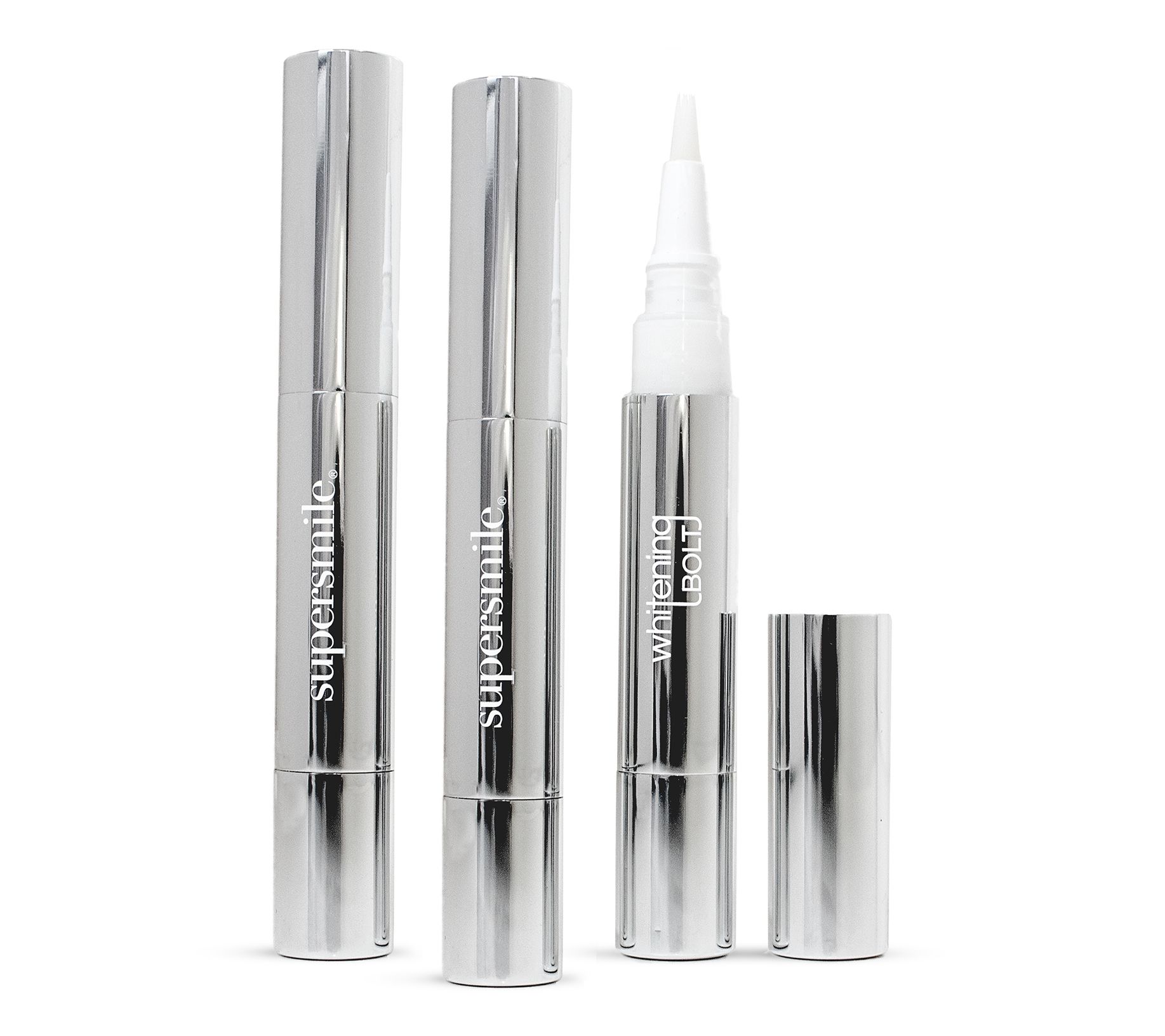 Meet your new favorite tooth-stain fighter: the Supersmile Whitening Bolt trio! This on-the-go innovation helps prevent stains, so you can enjoy coffee, tea, wine, fruit juices, and berries without worry. Each Whitening Bolt contains Calprox®, a proprietary ingredient of Supersmile that helps remove biofilm (protein) that forms on the teeth. The Calprox-infused formula subtly whitens teeth and coats enamel, helping to maintain from stains for up to six hours. It works on all smiles, including dentures, veneers, and bonded teeth.