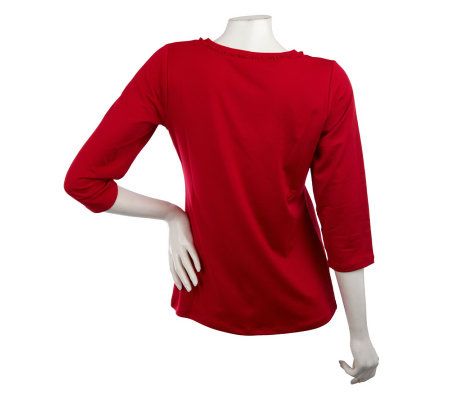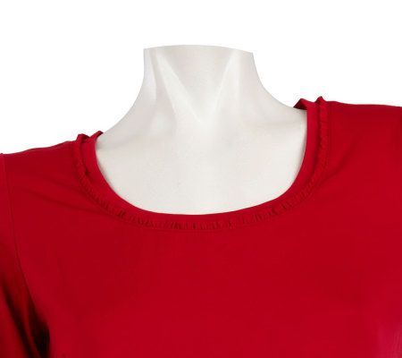 Putting the focus on you. The U-shaped neckline of this solid-color top, accented by a sweet ruffle detail, forms a nice frame for your favorite pendant or scarf. Stretchy, silky-smooth Butterknit fabric makes the shirt ideal for layering. From Susan Graver.