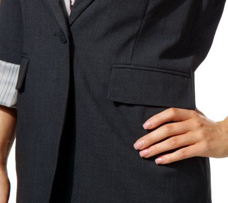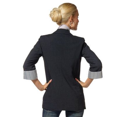 Savvy and smart, inside and out. With roll-up cuffs revealing a striking striped lining, this versatile solid jacket goes anywhere and with anything. With a generous cut and a touch of spandex, it's a perfect fit for the woman on the move. From Susan Graver.