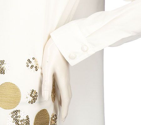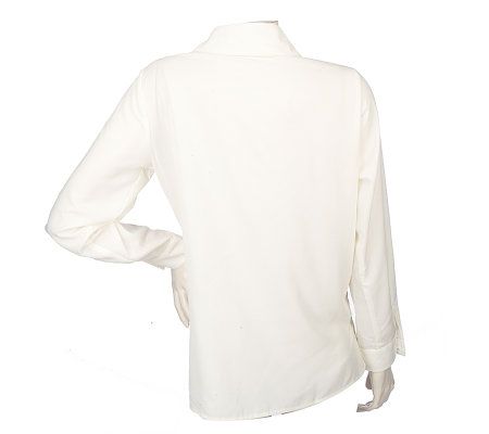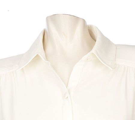 The simple blouse--with a twist. A circle motif sets this button-front blouse apart. A pointed collar and shirring at the shoulders provide a classic finishing touch. From Susan Graver.