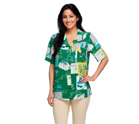 Flaunt your feminine flair! This camp shirt is done in a fun allover print that speaks to your easygoing attitude and sense of style. From Susan Graver.