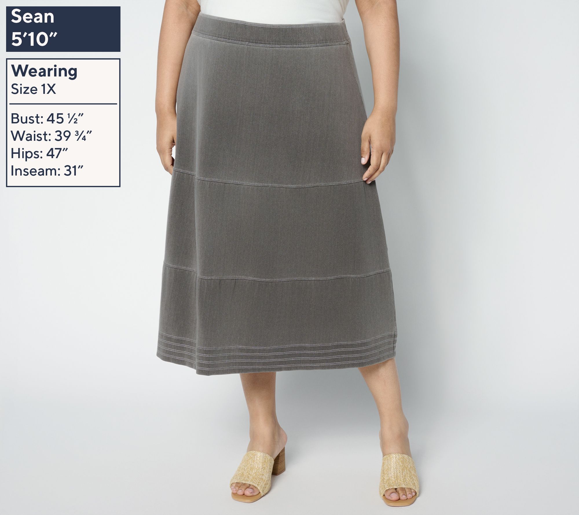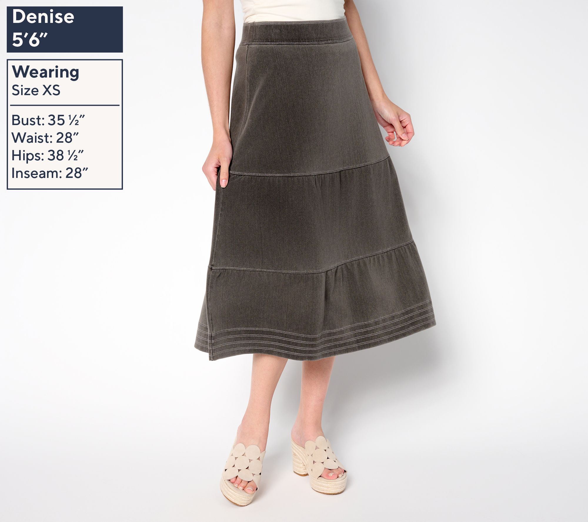 Unpredictable temps, run-around days, and hot flashes won't mess with your style vibe in this must-have midi skirt, crafted from cool-to-the-touch knit denim. Flowy, flattering tiers and the smoothest-ever waistband make it a regular in your rotation from sandal season to sweater weather. From Susan Graver.