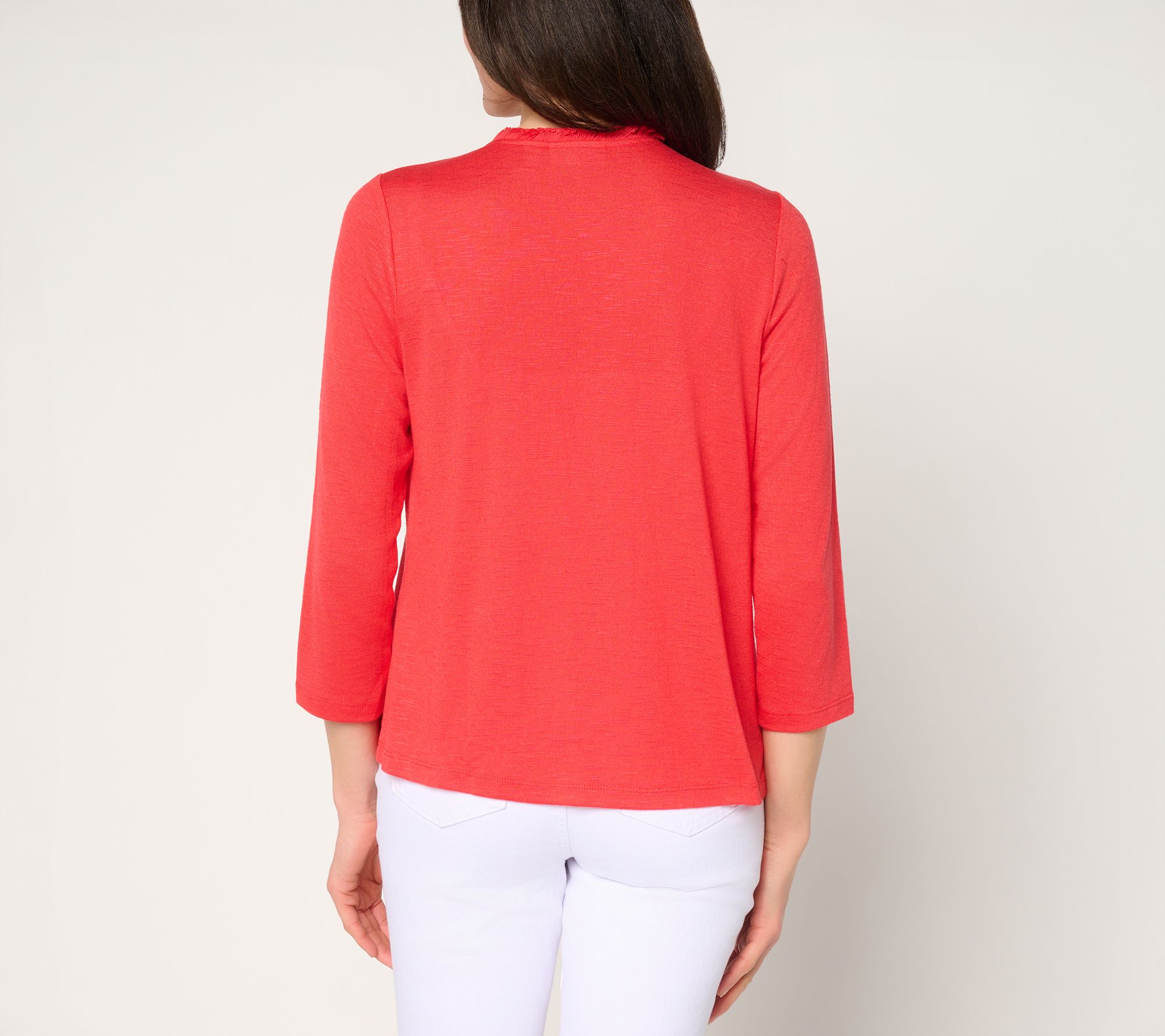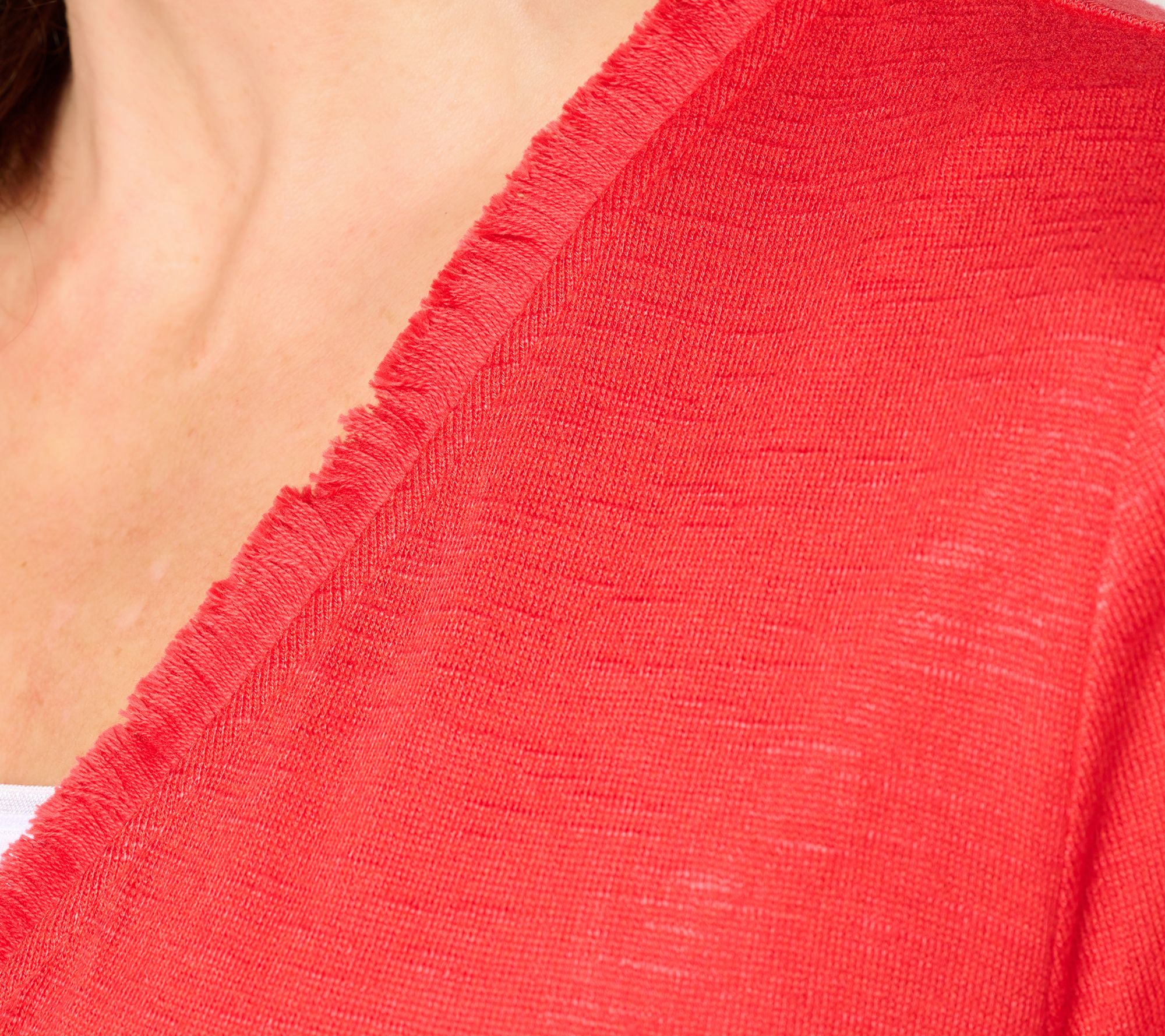 A light layer adds a polished touch when heading to dinner or running errands, and this shrug delivers with softly textured jersey knit and playful fringe detail. The 3/4-length sleeves keep things breezy, making it an easy choice over dresses, tanks, or tees throughout the season. From Susan Graver.