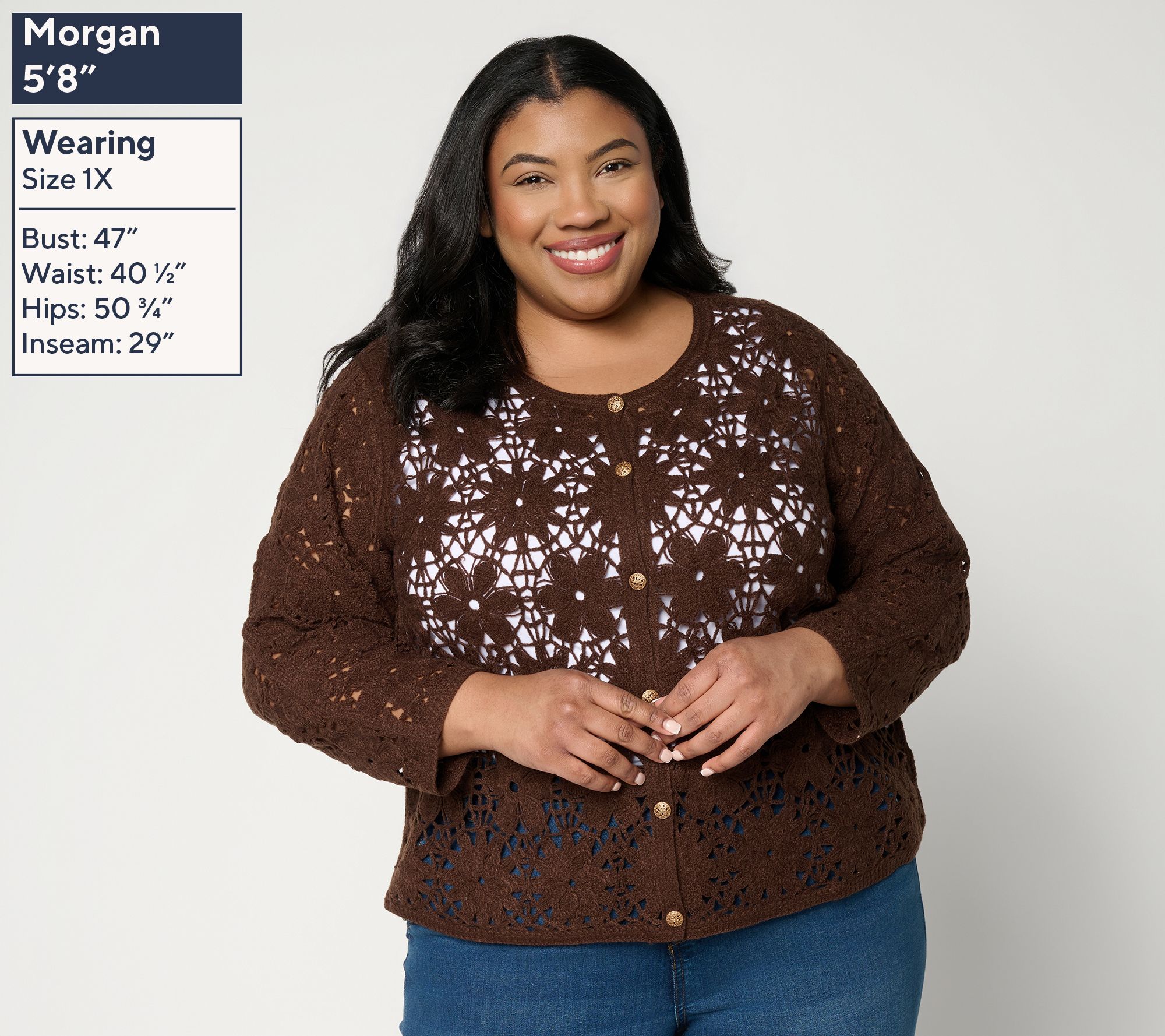 Have you noticed the surge of crochet inspo on your socials? Susan Graver takes this cozy comeback and elevates the look with her crochet shrug. Whether stepping out for a garden party or meeting friends for coffee, this airy topper adds a feminine touch and lightweight comfort to any 'fit. Novelty buttons and 3/4-length sleeves lend breezy ease, making it a chic layer to toss on over dresses or tanks when you want just a hint of coverage. From Susan Graver.