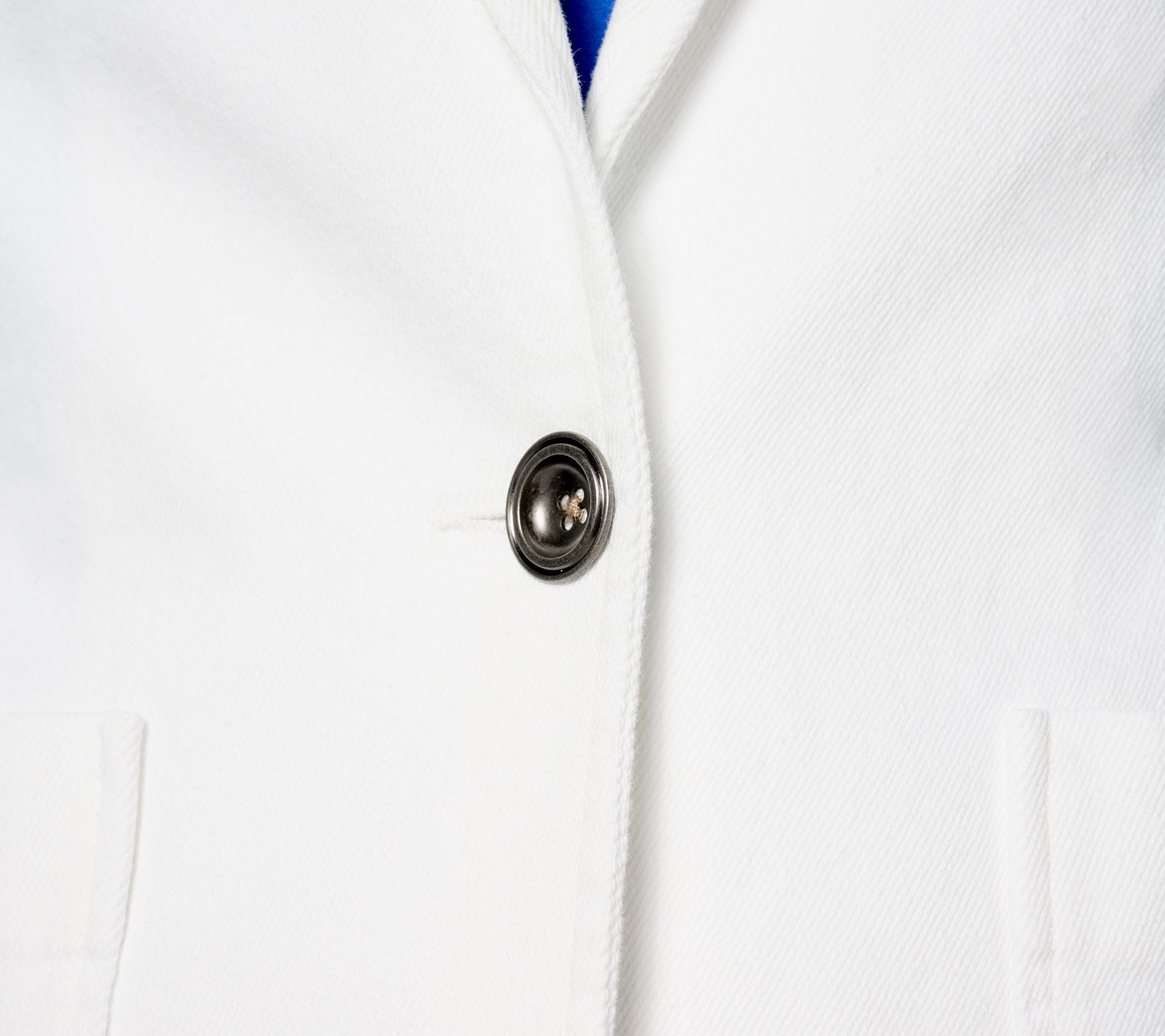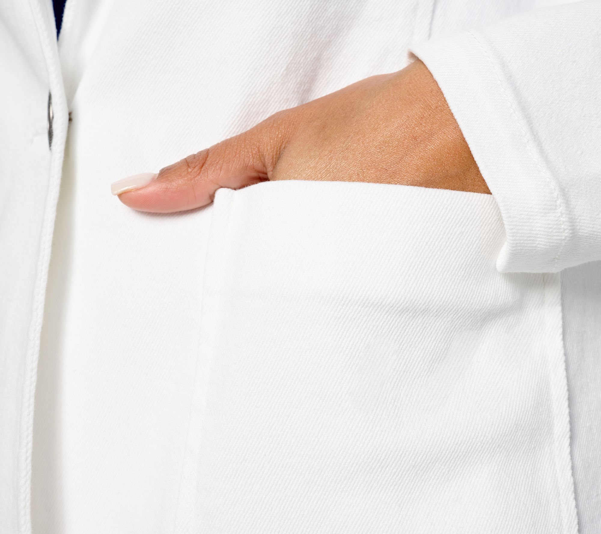 Features: notch collar, long sleeves, gathered sleeve caps, princess seaming, front patch pockets, center-back seam