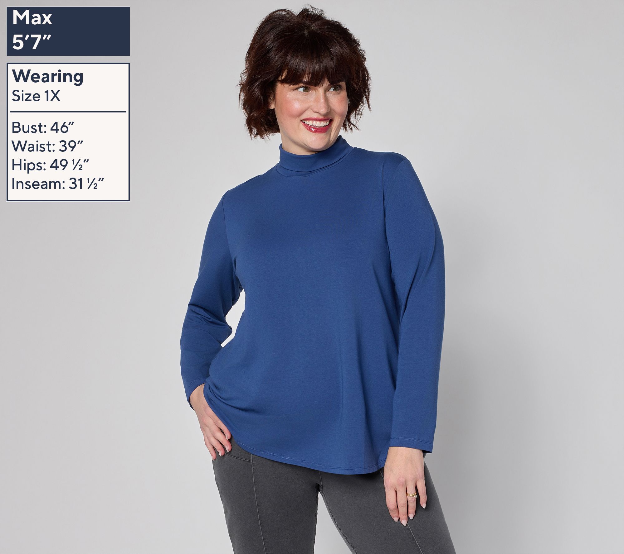 Layer on comfort with this cotton-modal turtleneck top, designed for both chilly morning walks and afternoons spent reading by the window. The soft, stretchy blend and curved shirttail hem give you a flattering silhouette, while long sleeves make it easy to style solo or under your favorite cardigan. From Susan Graver.