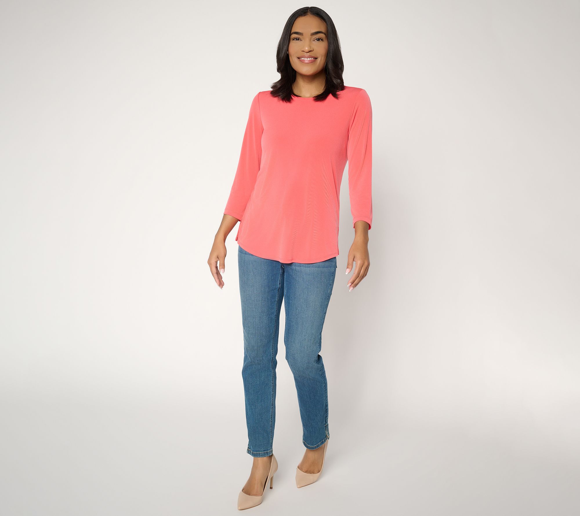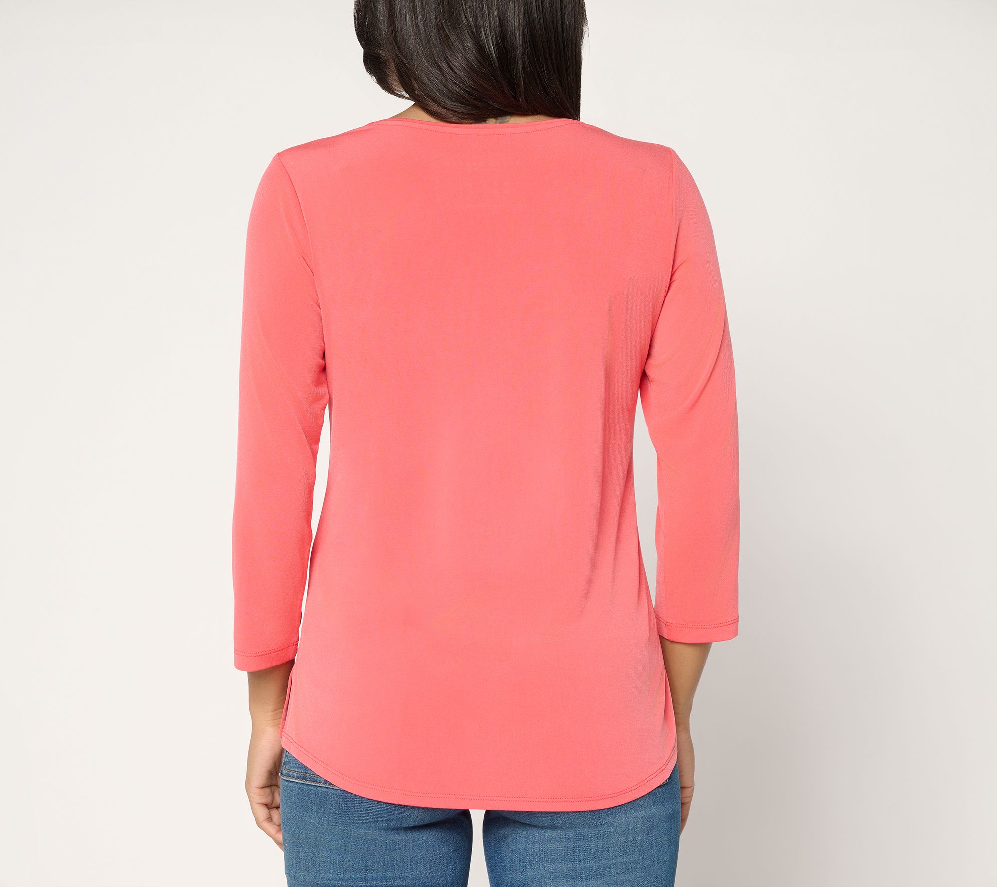 Start your morning routine on a bright note with this Liquid Knit® top, offering a silky-soft touch and a hint of stretch that moves comfortably throughout your day. Designed with a ballet neckline and 3/4-length sleeves, this stylish blouse easily dresses up with accessories or keeps it classic for casual outings. From Susan Graver.