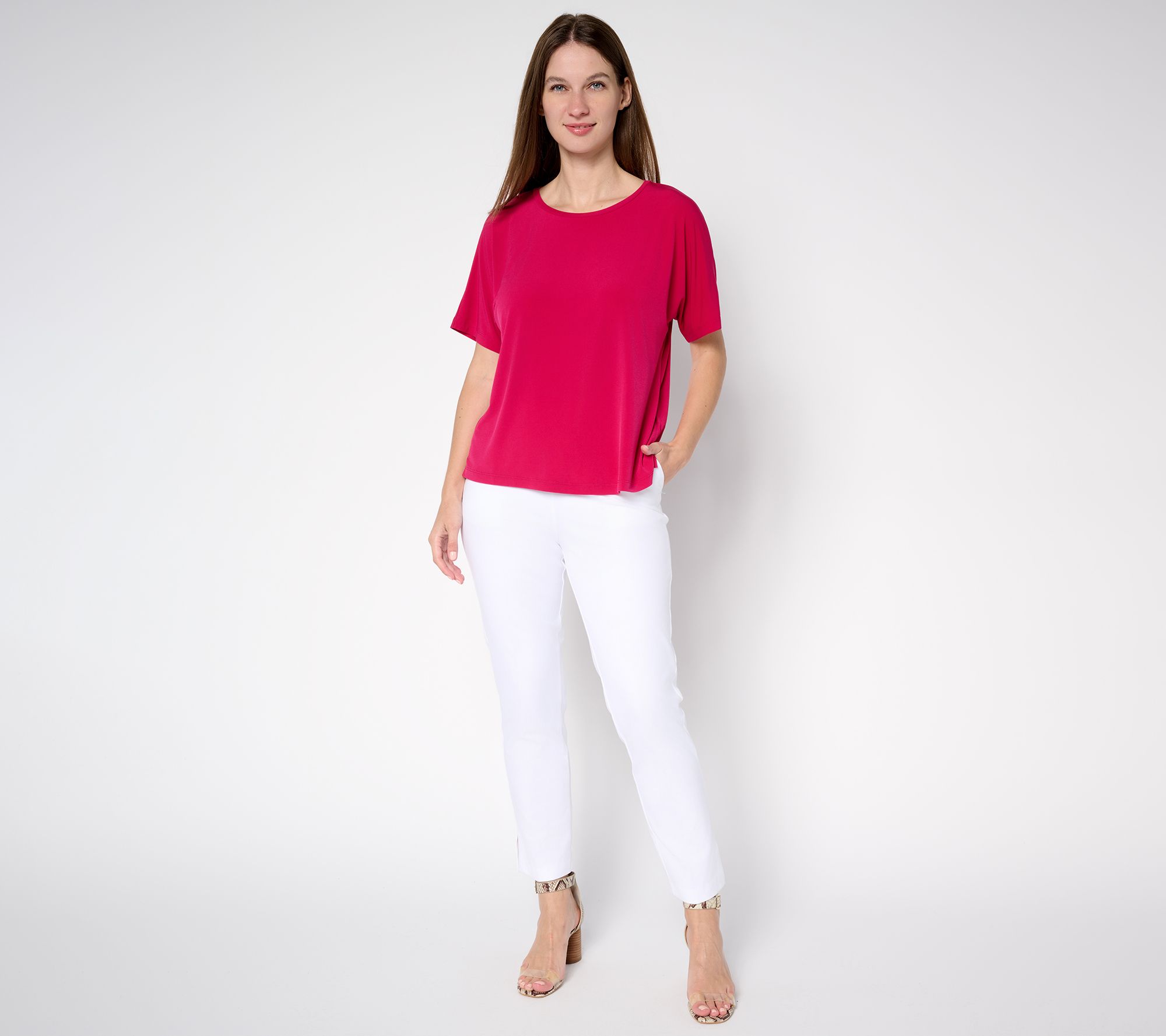 Easygoing days call for style that feels effortless. This dolman-sleeve top slips on comfortably, thanks to the soft Liquid Knit® fabric and relaxed cut, making it a go-to for everything from coffee dates to weekend errands. A jewel neckline and straight hem with subtle side slits add that little something extra, while the slightly shorter length layers beautifully over your favorite denim or skirts. Dress it up with a statement necklace when the occasion calls for carefree confidence. From Susan Graver.