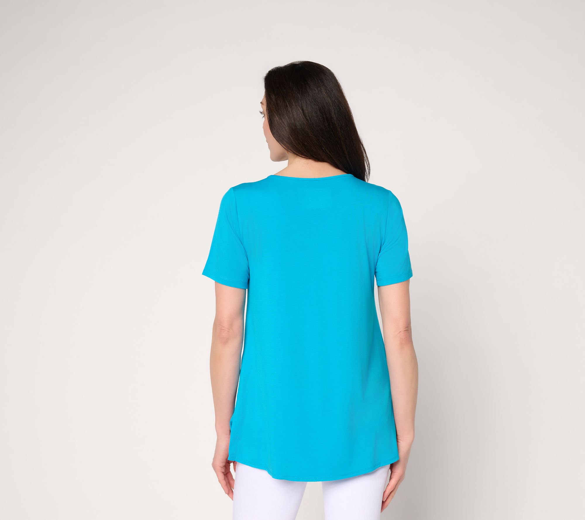 Whether you're heading to the office or enjoying lunch with friends, this knit blouse makes getting ready a breeze. Soft rayon blend fabric drapes with a flattering high-low hem and an easy pullover design, while the V-neckline and short sleeves keep things polished yet laid-back. From Susan Graver.