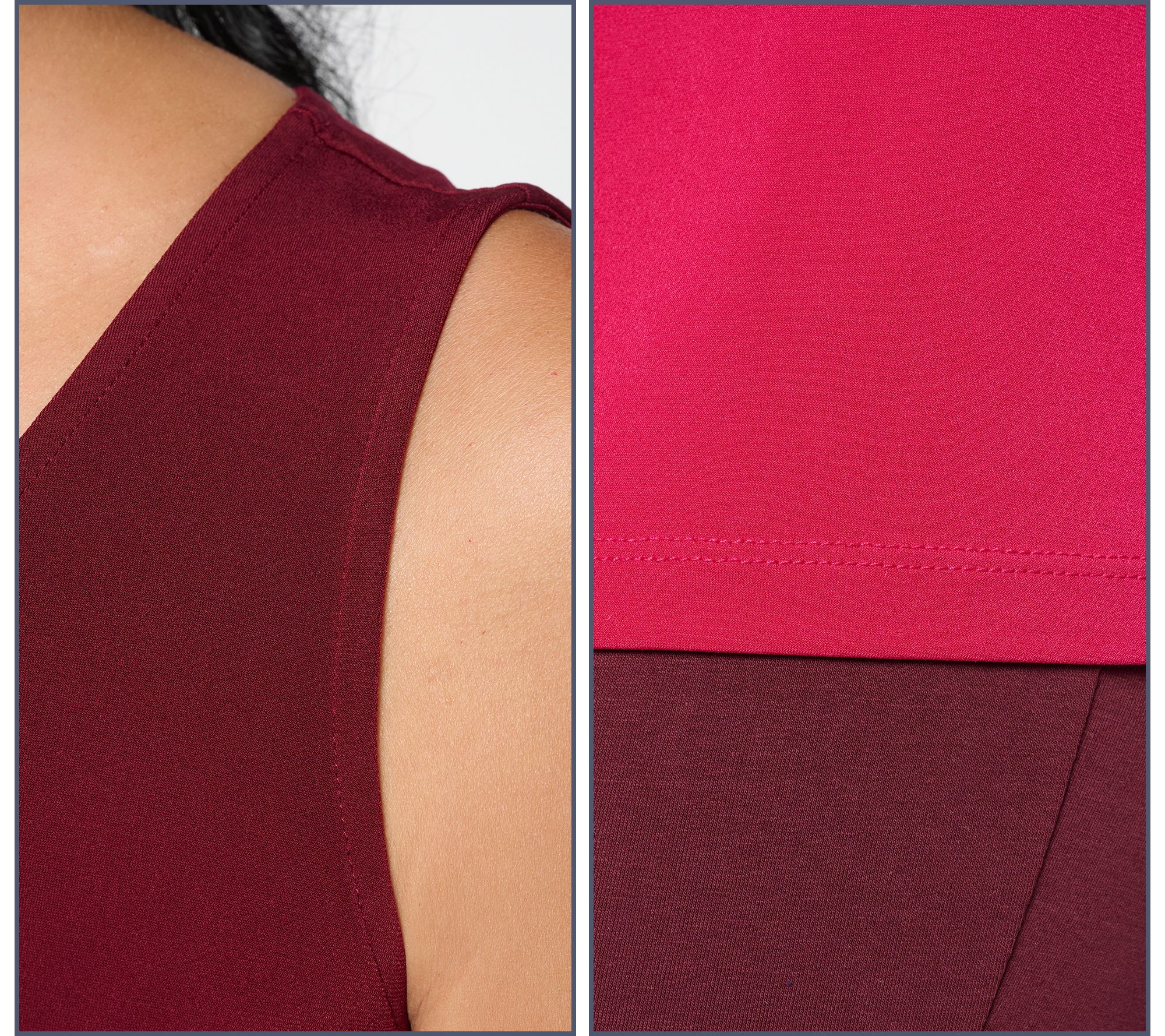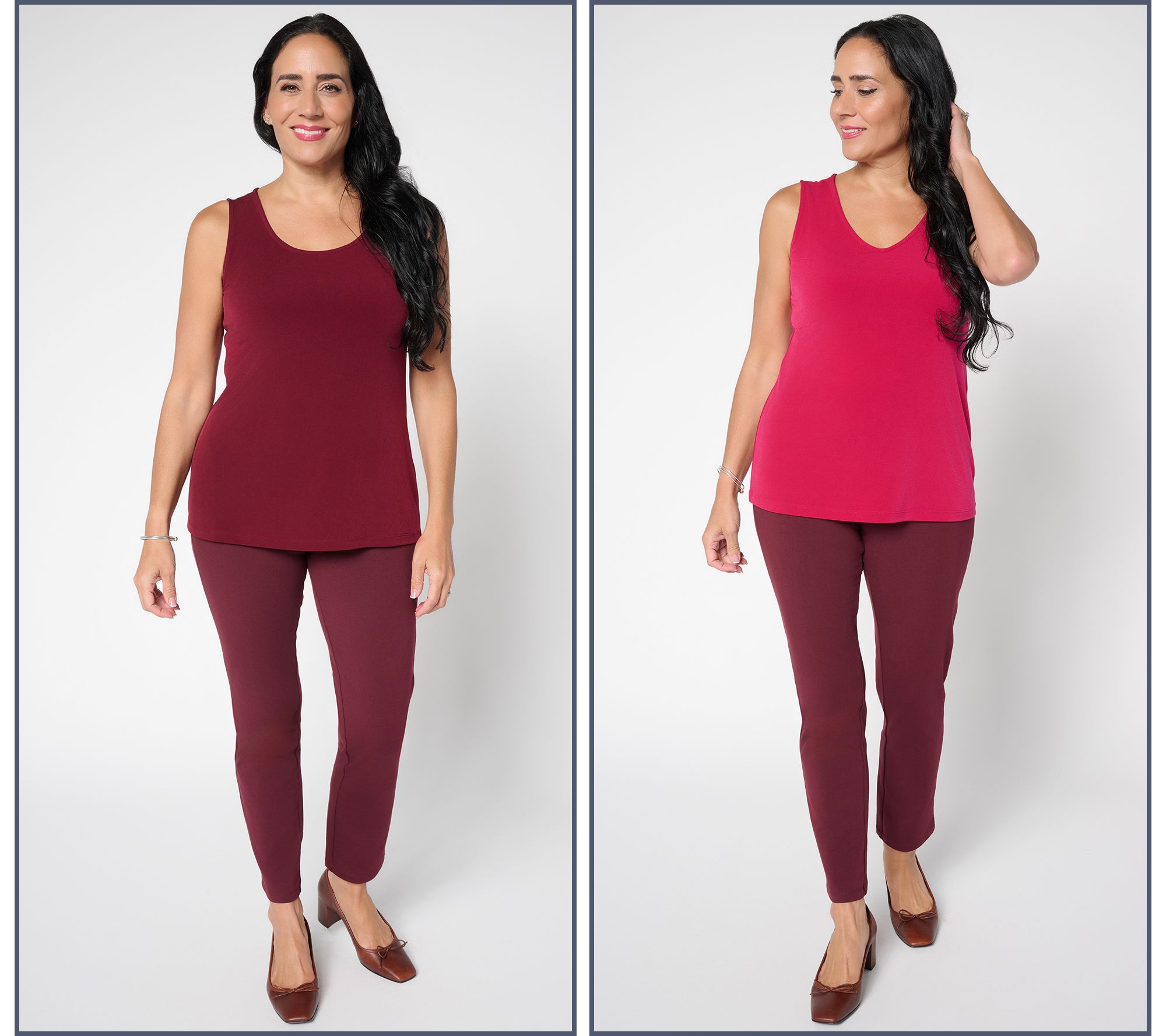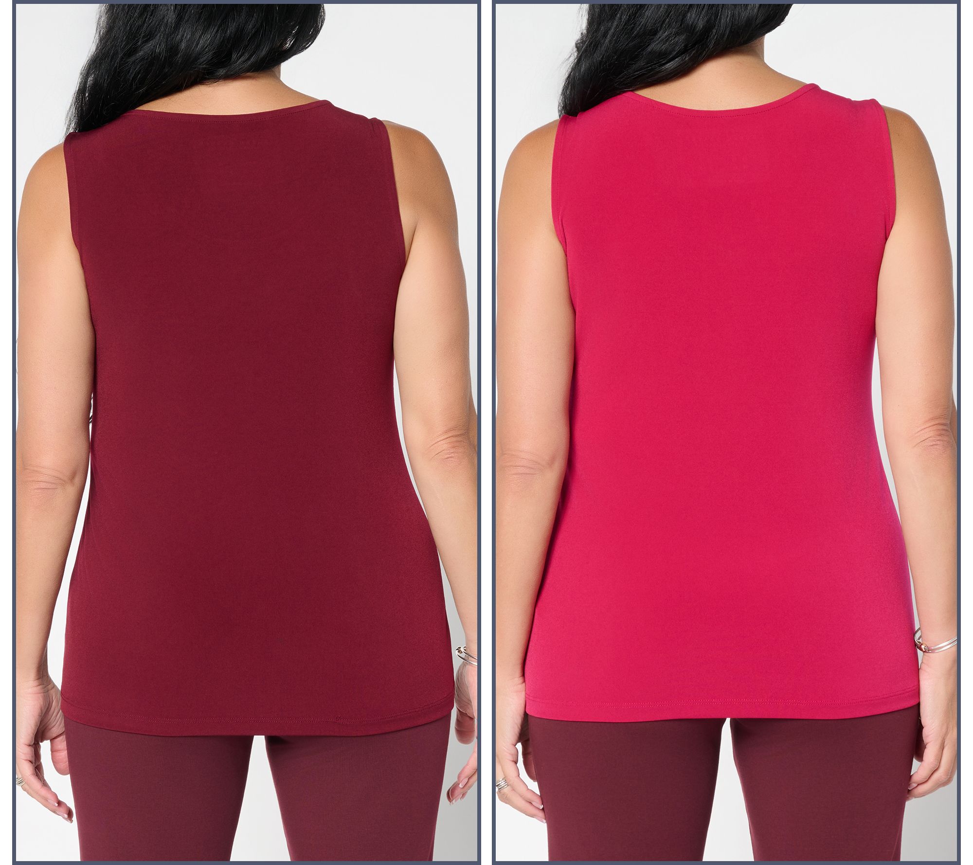 Great for layering under a blazer at work or styled solo on the weekend, this set of two tank tops lets you switch up your look with both V-neck and scoopneck silhouettes. The smooth, easy Liquid Knit® fabric makes for a polished finish and lasting comfort, ready for everything from desk days to dinner plans. From Susan Graver.