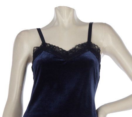 Smooth moves. Create a subtly sexy look with this velvet tank top. Placed under a business-like blazer or a comfy cardigan, it offers a tantalizing peek of its laced-trim neckline and soft, supple velvet fabric. From Susan Graver.
