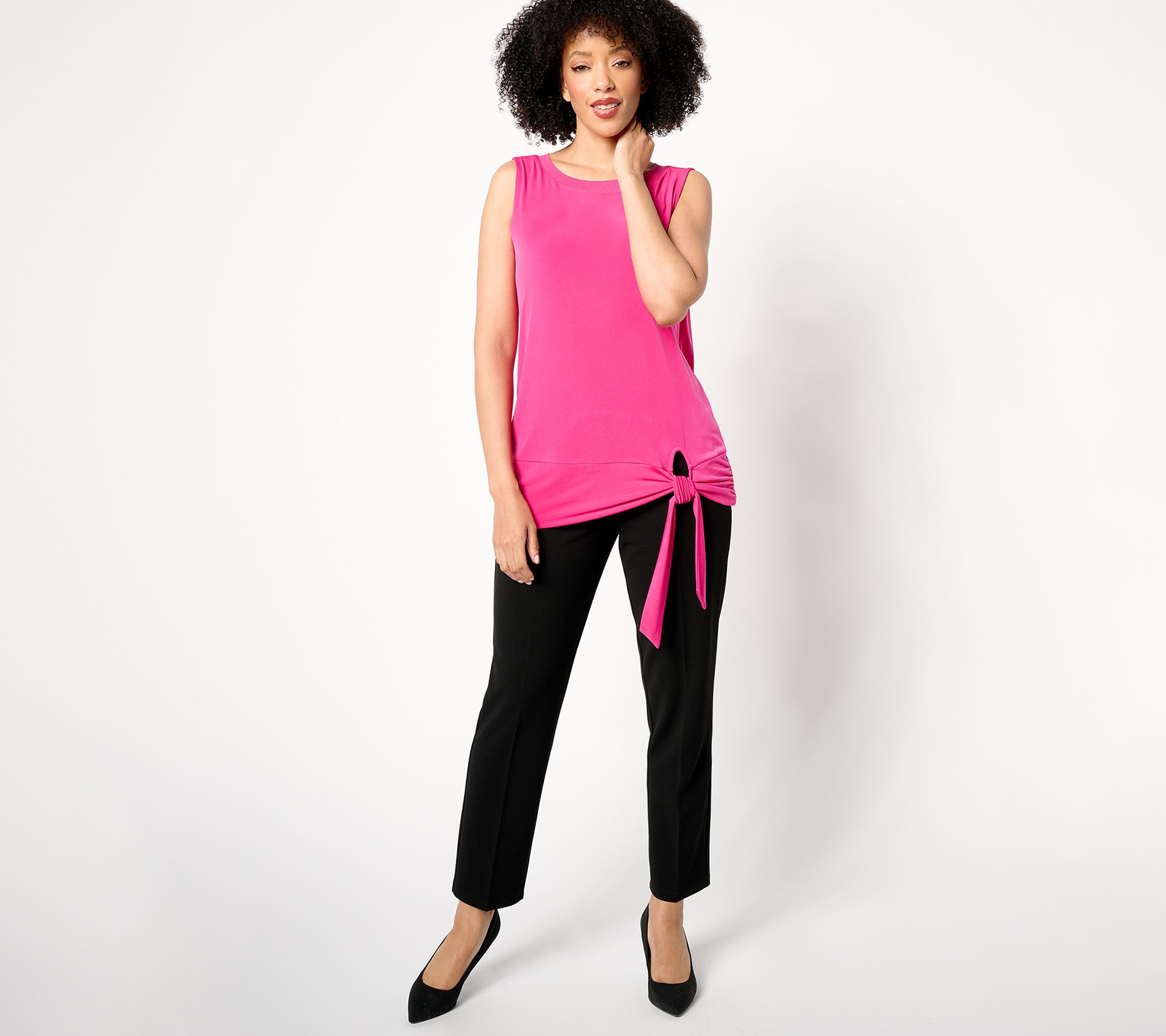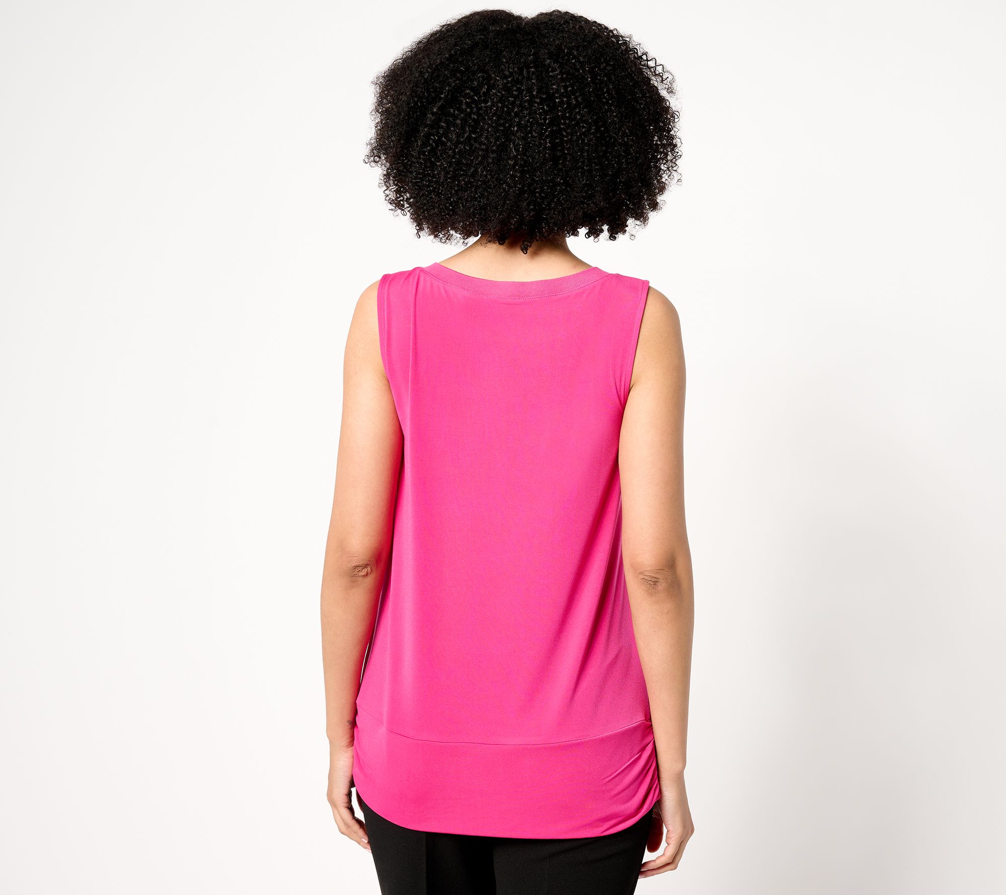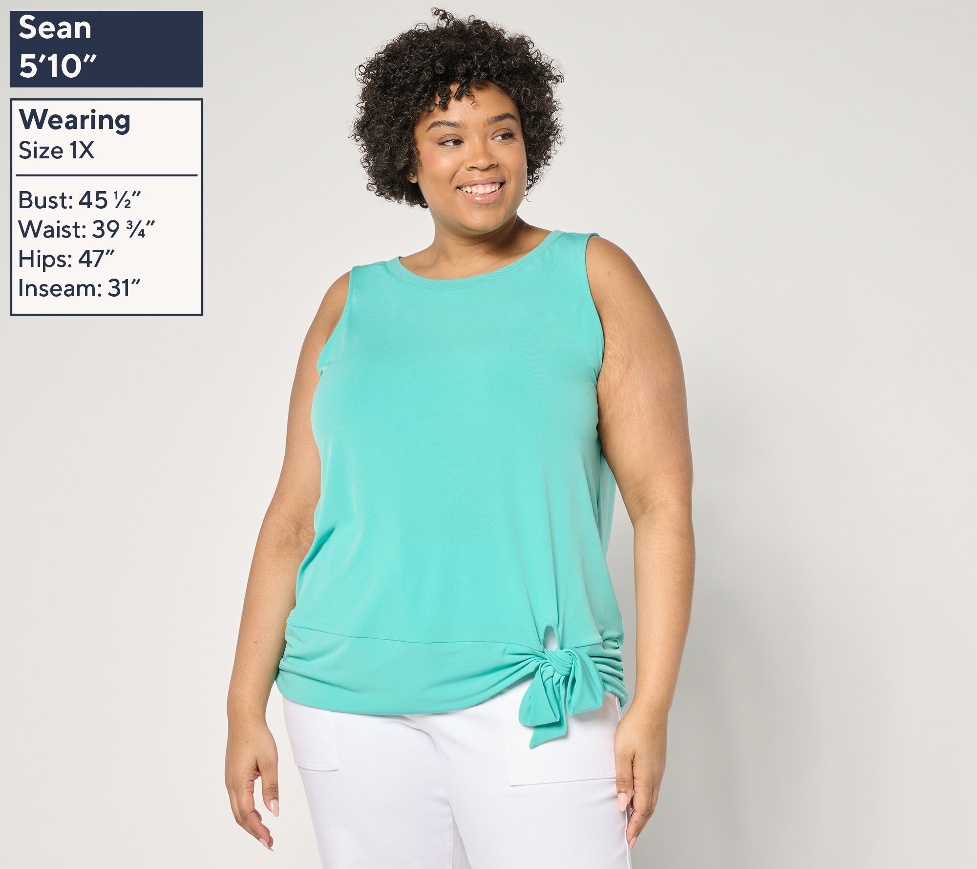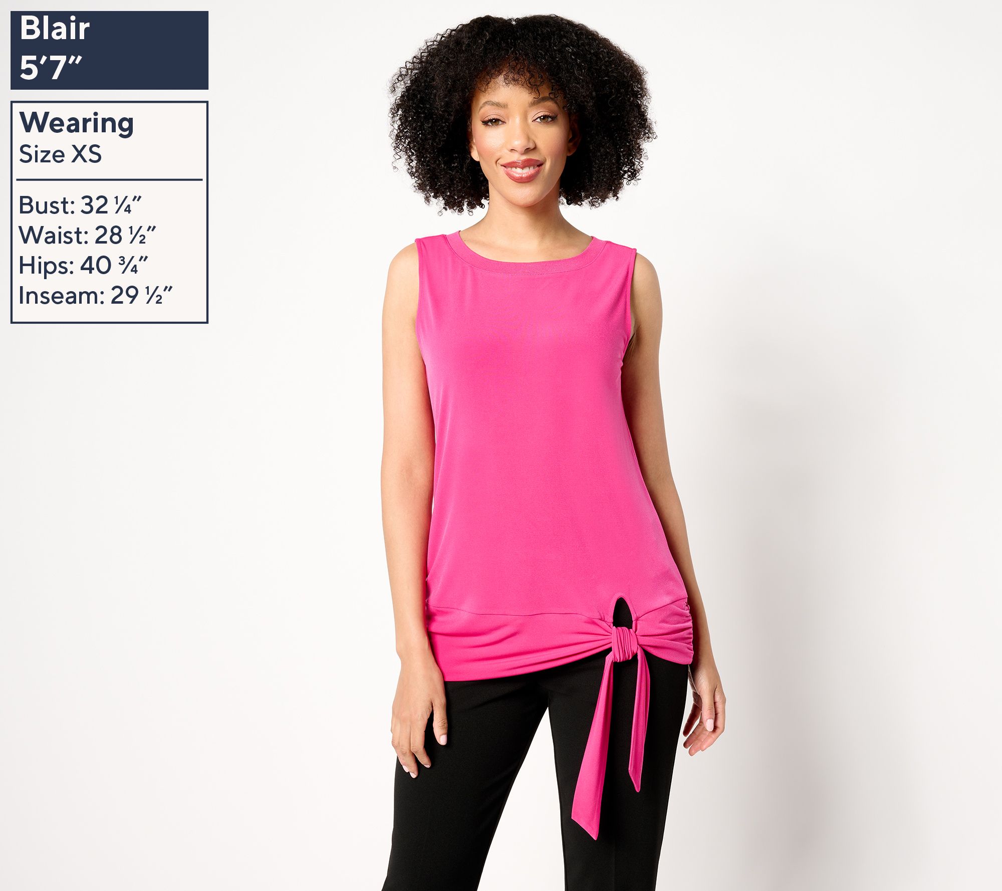 Features: pullover style, sleeveless, bateau rib neckband, adjustable tie band designed to be knotted or folded over, side-seam ruching