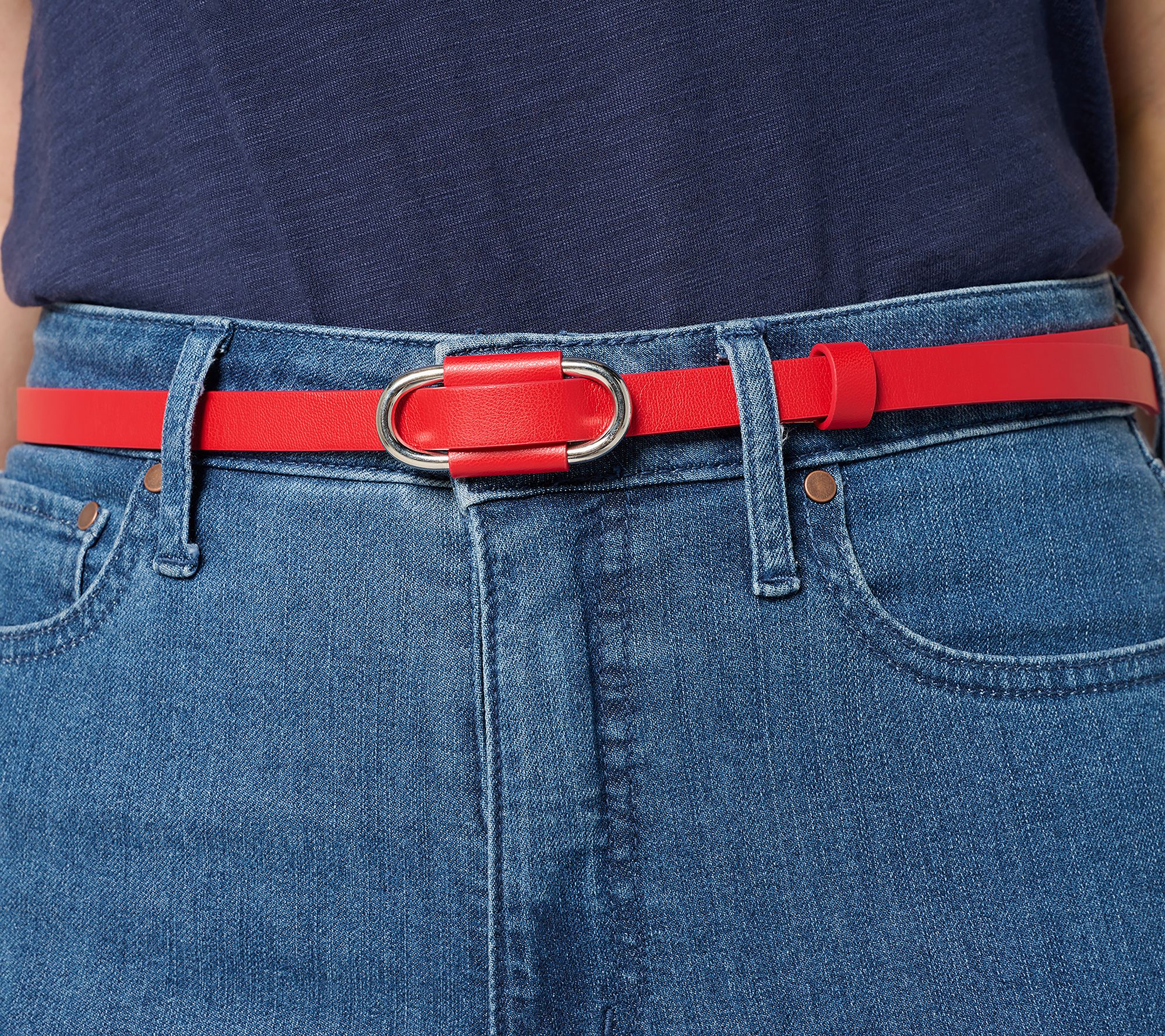Features: faux leather belt with pull-through buckle