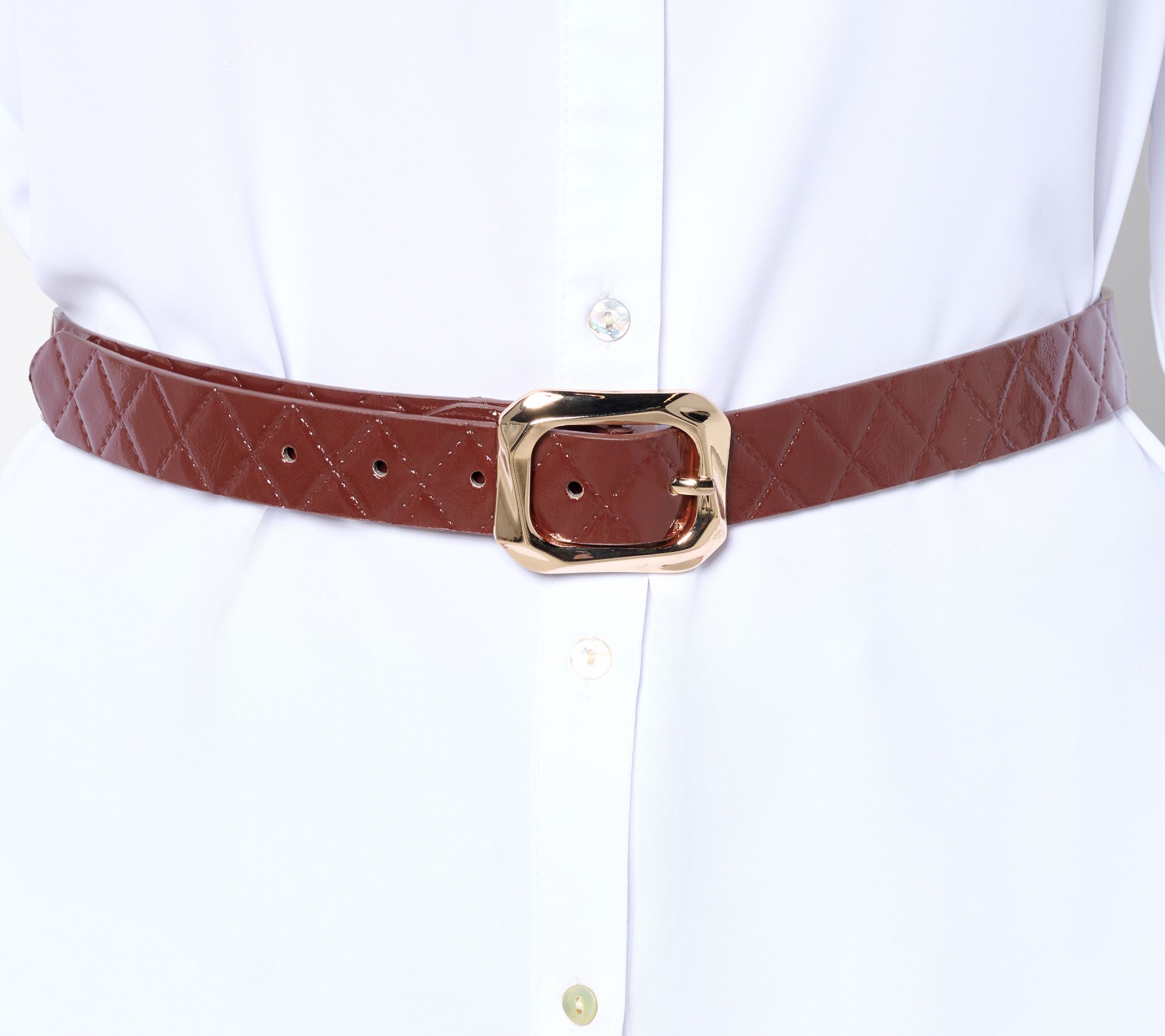 For cinching, snatching, or shaping, this faux patent leather belt from Susan Graver adds a sleek, tailored finish to both work and weekend styles. The quilted design brings instant polish whether cinching cardigans, creating curves on maxi dresses, or adding elevated interest to everyday denim. From Susan Graver.