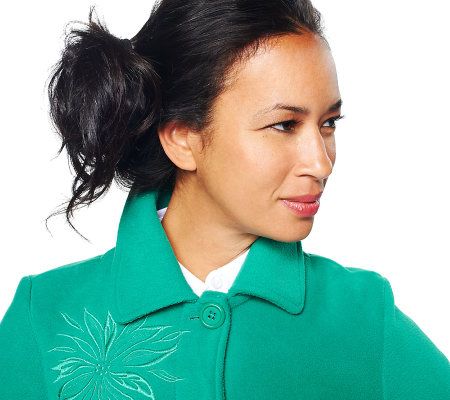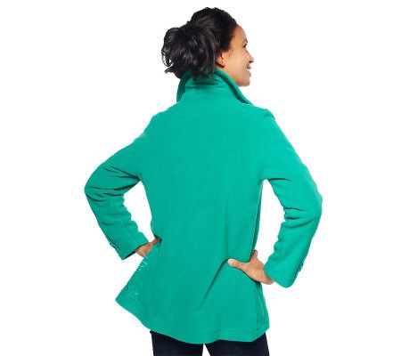 Swing through the day wearing this happening jacket. Tonal embroidery fashions the front and back floral design while French binding details the inside seams. Fleece and a button-front closure keep you warm as you walk elegantly along. From Susan Graver.
