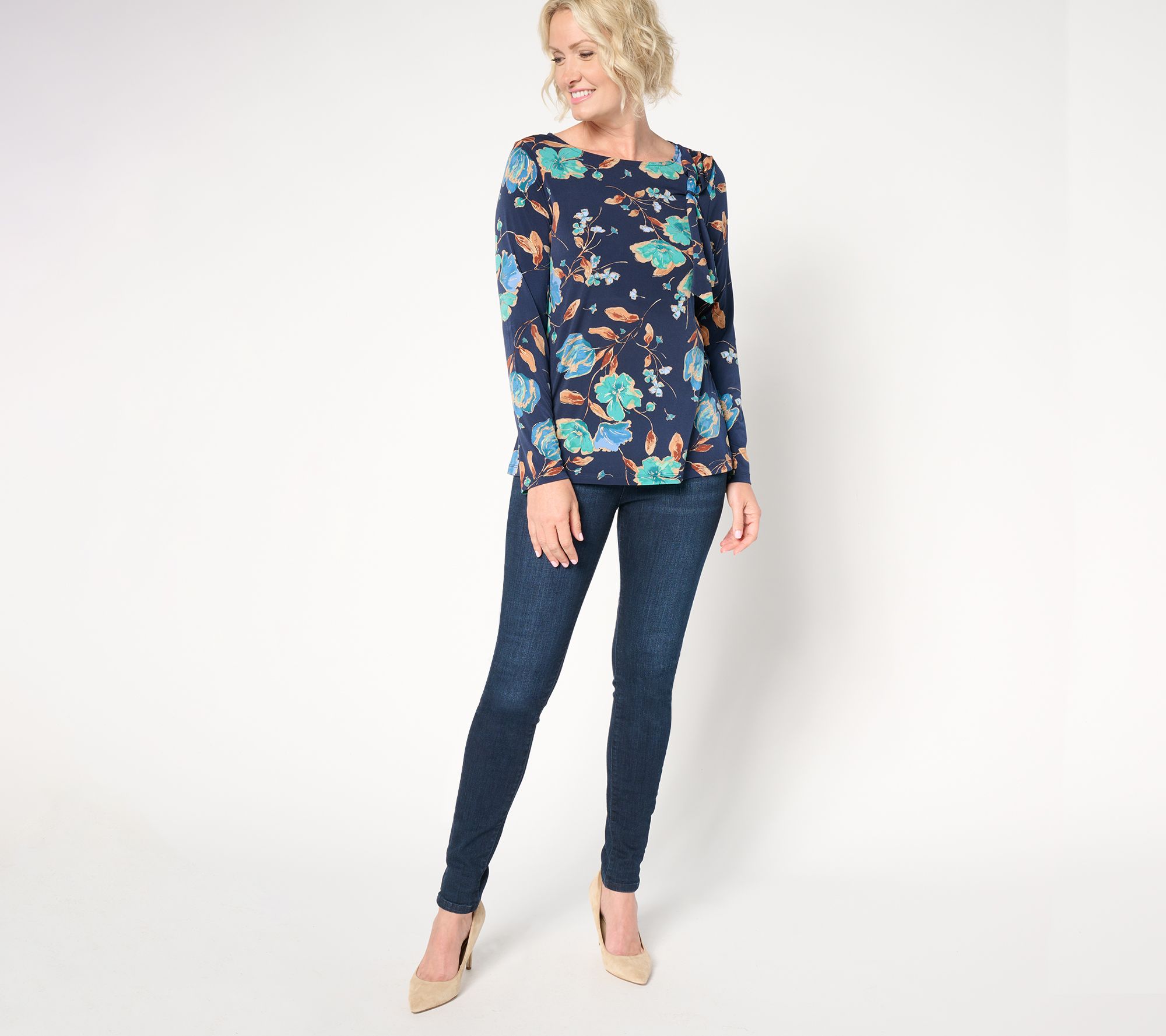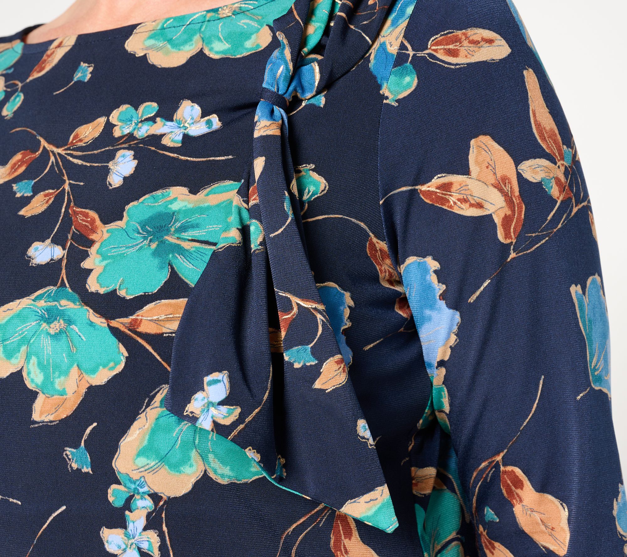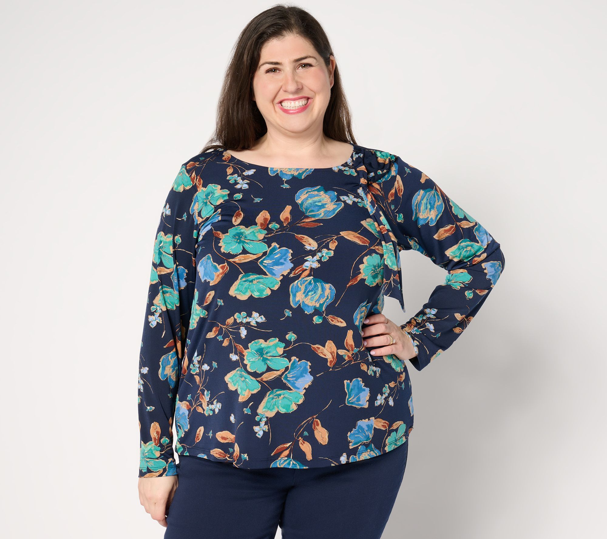 A fabulous feel and fluid drape aren't the only features this prettily patterned top has going for it. The subtle shimmer and flirty tie detail at the shoulder are exactly the chic deets Susan knows we crave. And the flattering fit of Liquid Knit®? We're loving every inch of it! From Susan Graver.