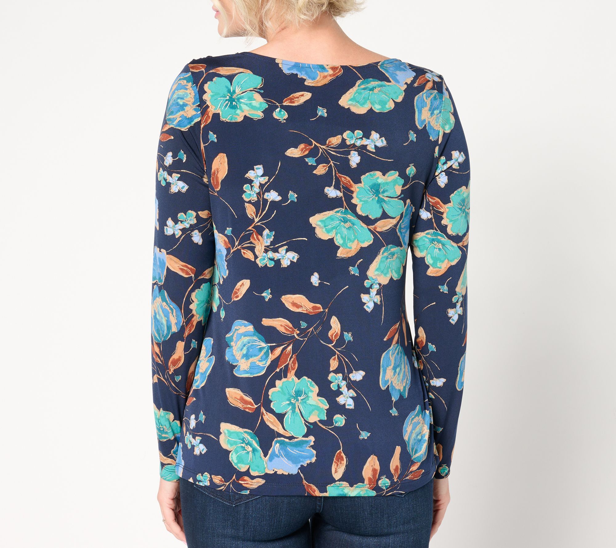Susan Graver Foil Printed Liquid Knit Long Sleeve Top w/ Tie Detail