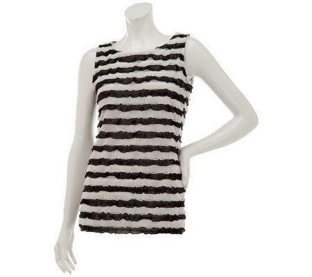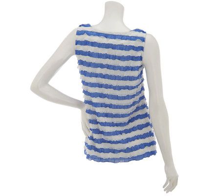 Spring into warm weather! Striped ruffles lend a bright, bouncy vibe to this sleeveless knit bateau neck top. From Susan Graver.