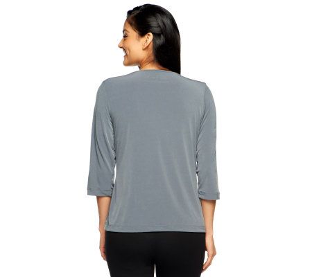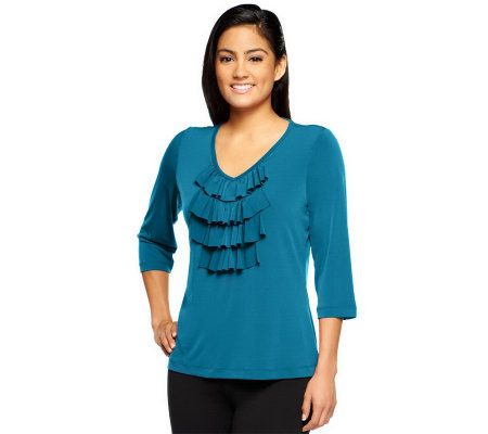 Susan Graver Liquid Knit 3/4 Sleeve V-Neck Top with Ruffle Front