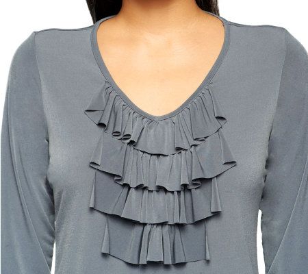 It's time to get all dolled-up! The tiered ruffle at the V-neckline makes this shirt fresh, youthful, and gloriously girly. The solid-colored Liquid Knit fabric flatters your curves and shows the world your womanly charm. From Susan Graver.