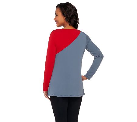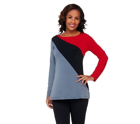Fluid motion. Go with the flow of this Liquid Knit(R) top as you move through your day with effortless style. A contemporary color-blocked and seamed pattern makes a bold statement. From Susan Graver.