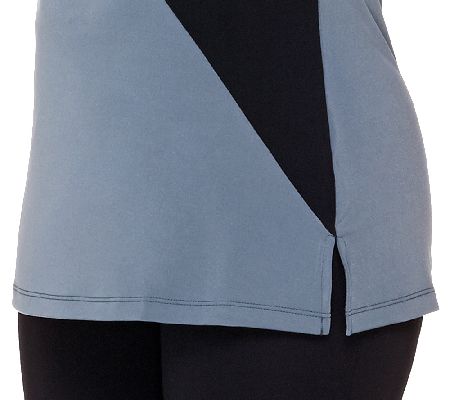 Scoop neckline, long sleeves, angled color-blocked seam detail, straight bottom hem, side slits