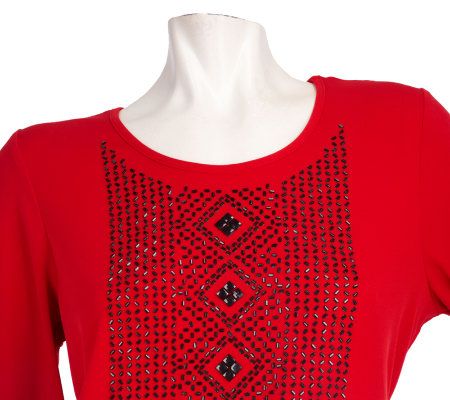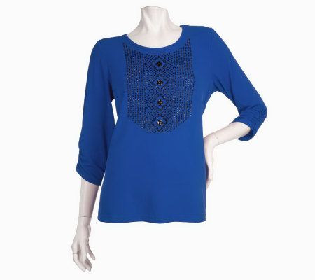 Susan Graver Liquid Knit Beaded Front Ruched Sleeve Top