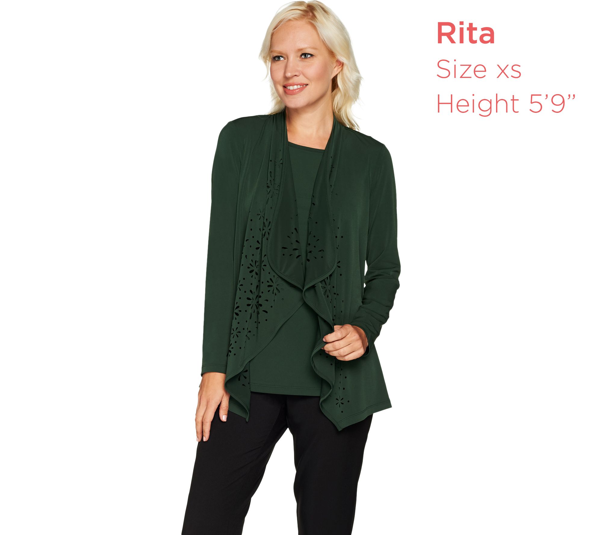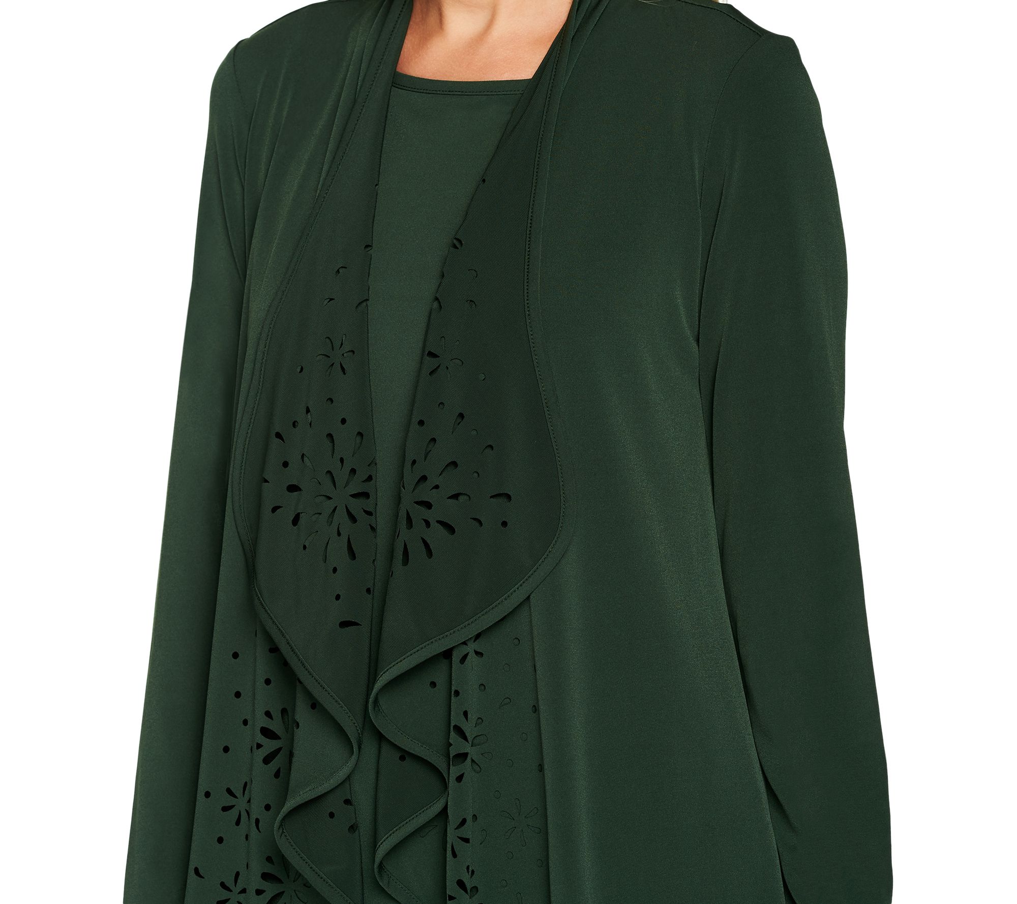 - Cardigan Features: cascading open front with laser-cut detail on both panels; long sleeves