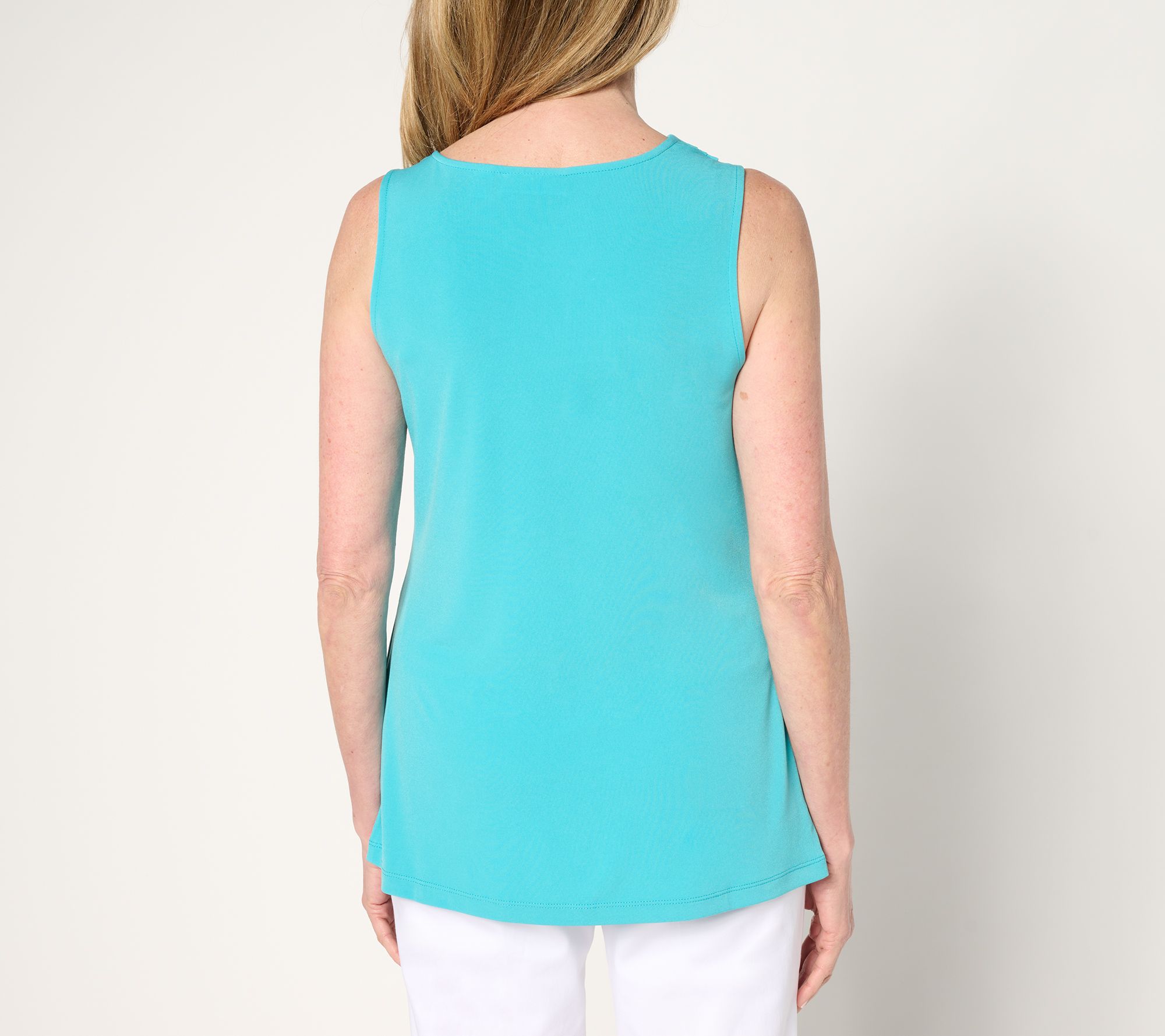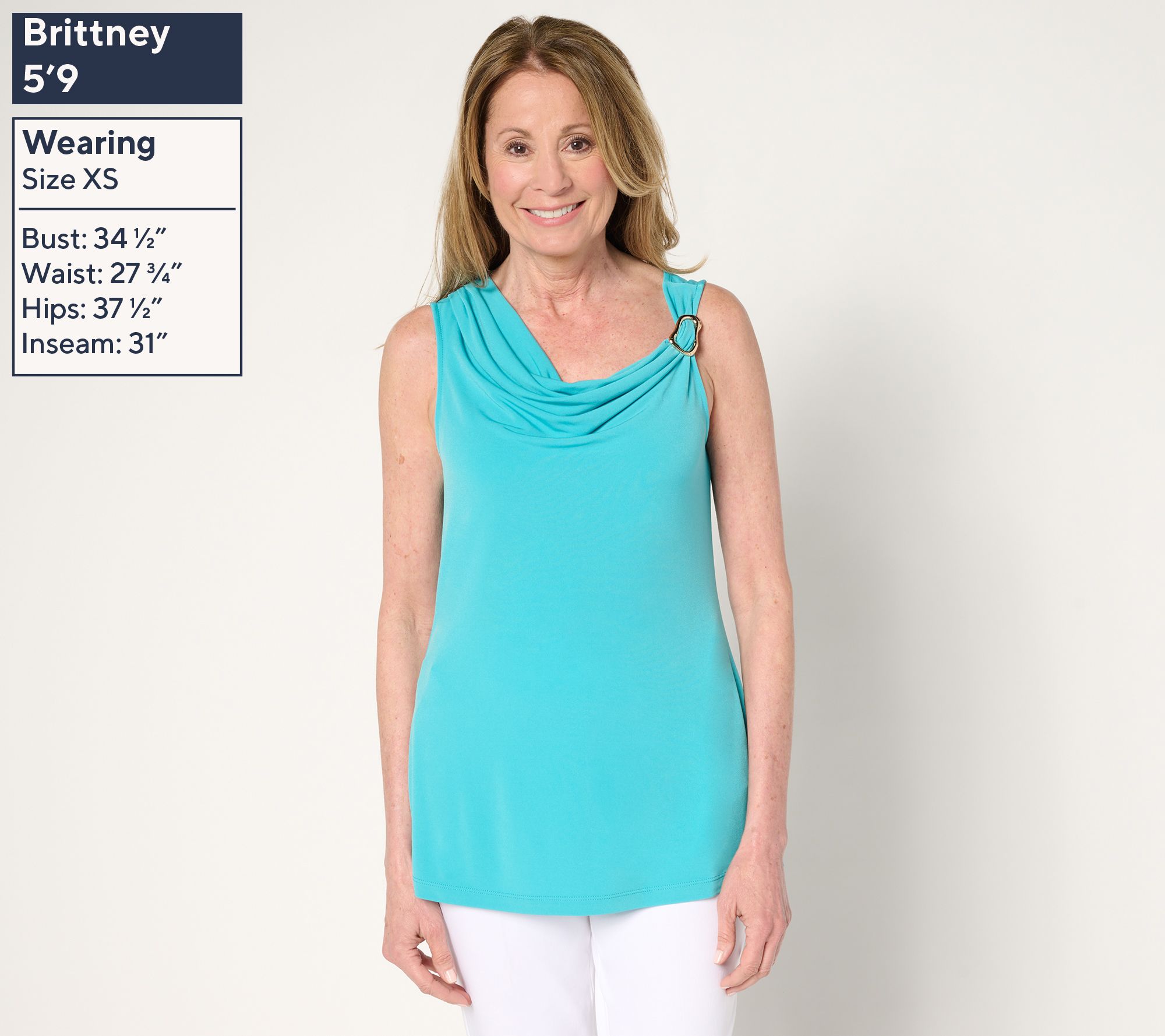Ready to add some sleek sophistication to your style? This sleeveless top offers a chic look with its cowl neckline and distinctive slide buckle trim on the left shoulder, while the smooth Liquid Knit®, fabric gives it a comfy feel. Perfect for summer soirees or for layering with blazers and sweaters when the weather gets cooler. From Susan Graver.