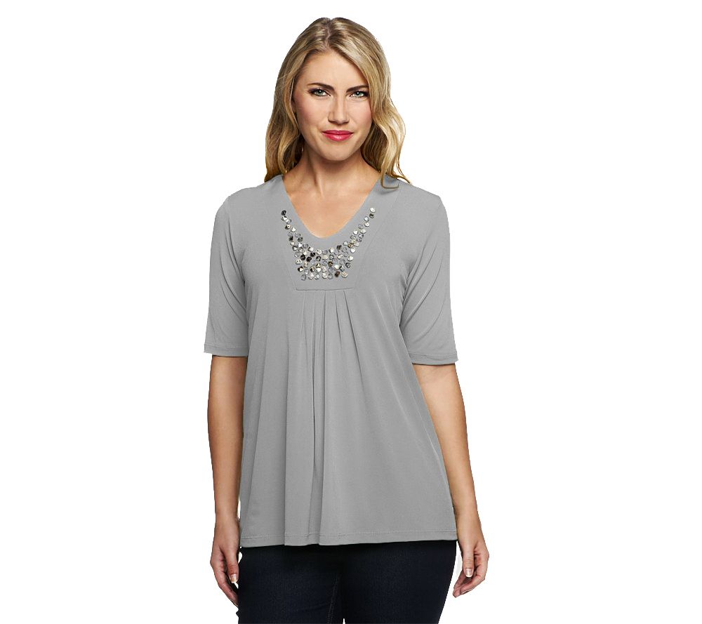 Everyday elegance never goes out of style. Metallic and mixed stone embellishments along the deep V-neckline make this top anything but basic. They add just the right amount of fashionable flair to take you effortlessly from day to night--office to dinner, lunch with the ladies to an evening on the town.