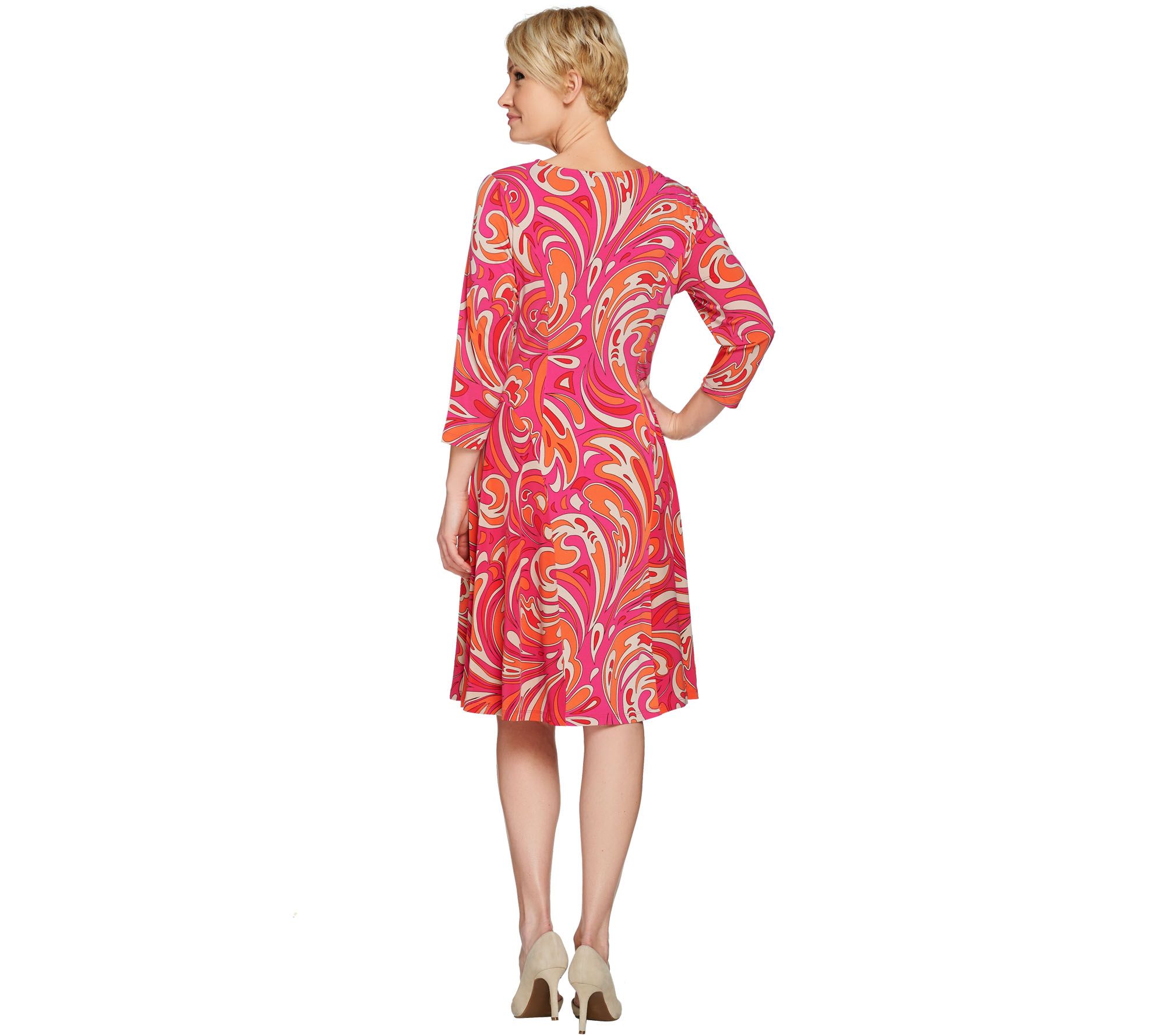 The easy-wearing Liquid Knit design features 3/4-length sleeves and pretty princess seams for a graceful drape, along with enamel keyhole detailing at the scoop neckline to add a touch of fun. Chic, comfortable, and ready for anything, this dress is so cute you may want to grab more than one. From Susan Graver.