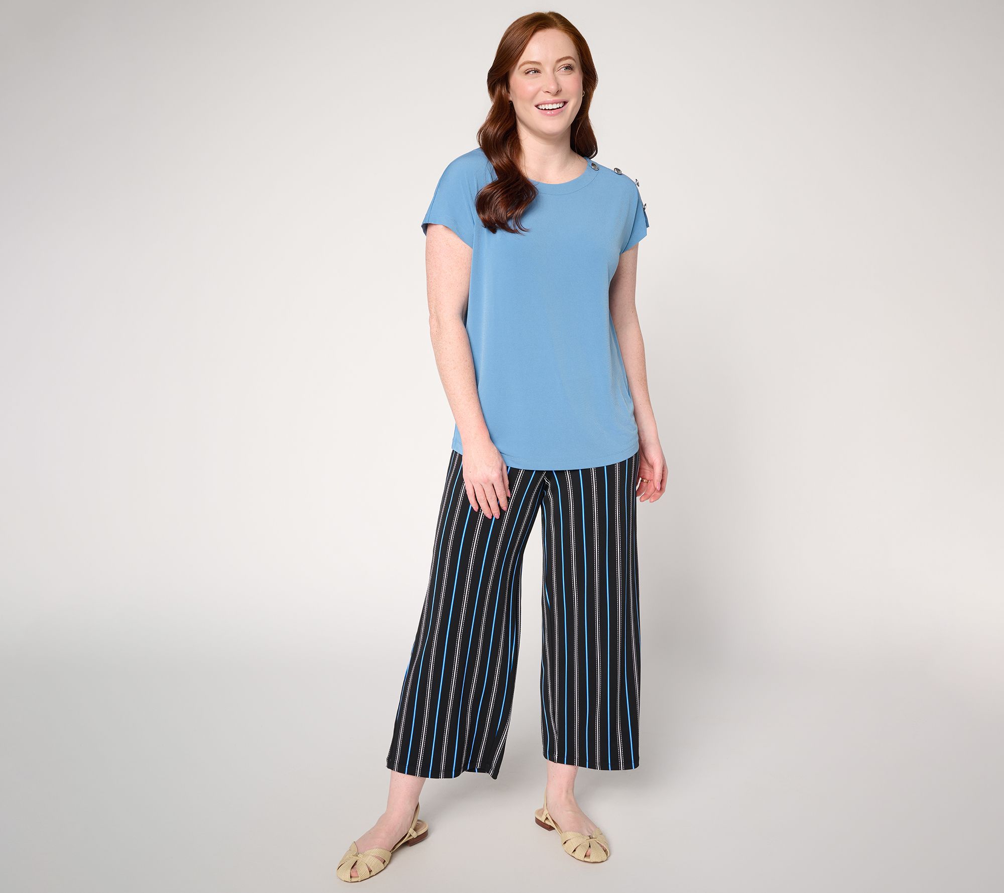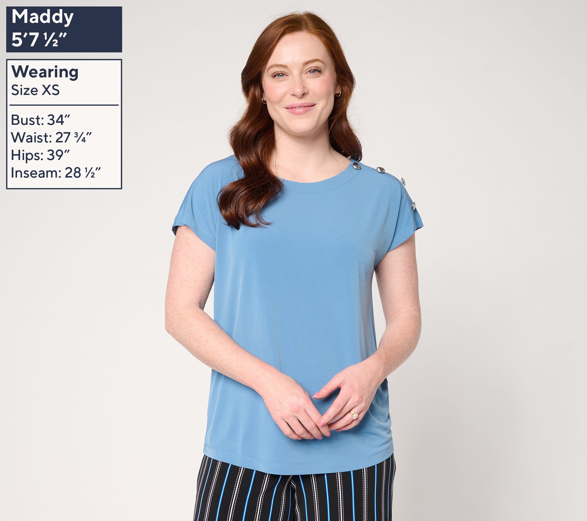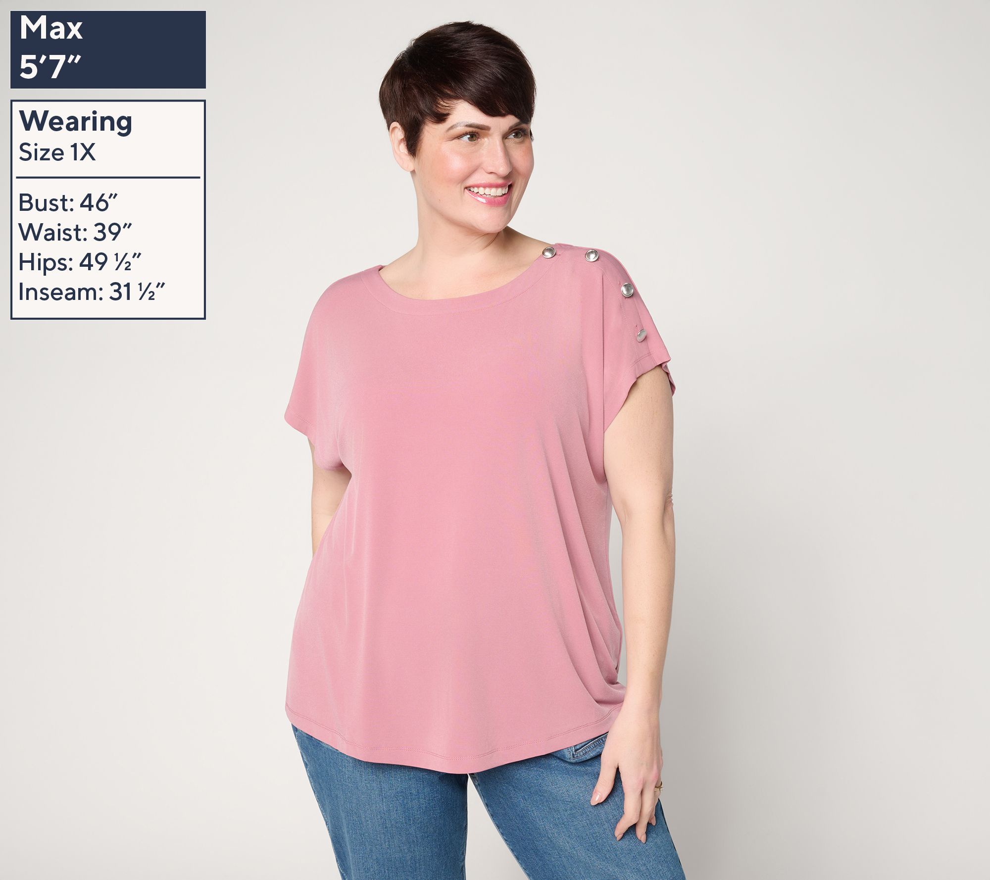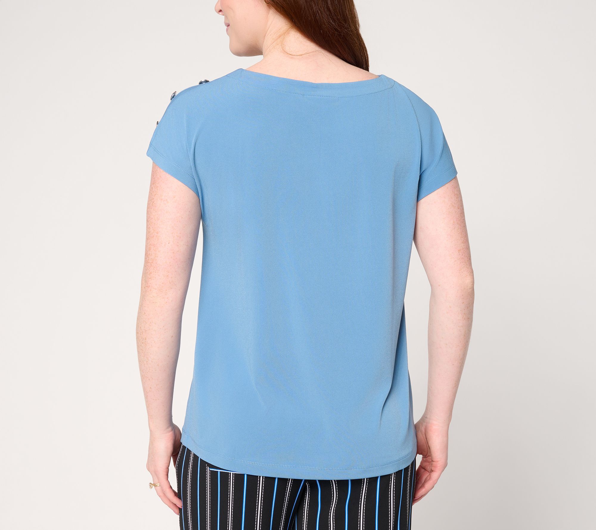 Hardware update! Glossy buttons along the shoulder of this Liquid Knit® top give your look instant polish. The smooth, easy-care knit offers relaxed comfort and lays beautifully over jeans or trousers -- making layering or solo wear a breeze. From Susan Graver.
