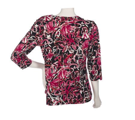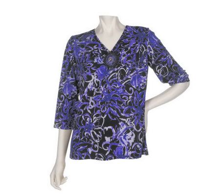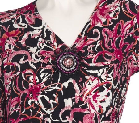 All the style that's fit to print. An allover pattern decorates this ruched V-neckline top, whimsically enhanced by novelty jewelry accents. From Susan Graver.