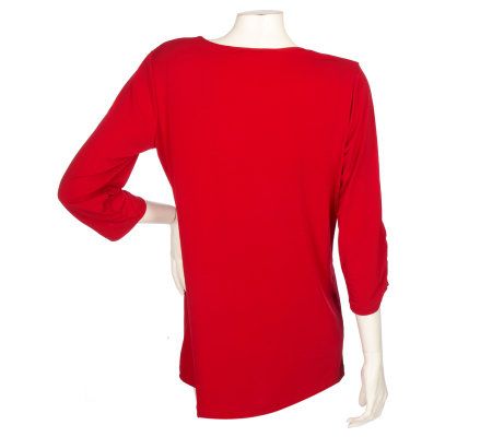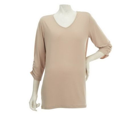 Basic? Yes. Ordinary? No! Crafted in the ever-flattering Liquid Knit(R) fabric, this solid-colored top gets a nice pop of style from ruching detail on its 3/4 length sleeves. From Susan Graver.