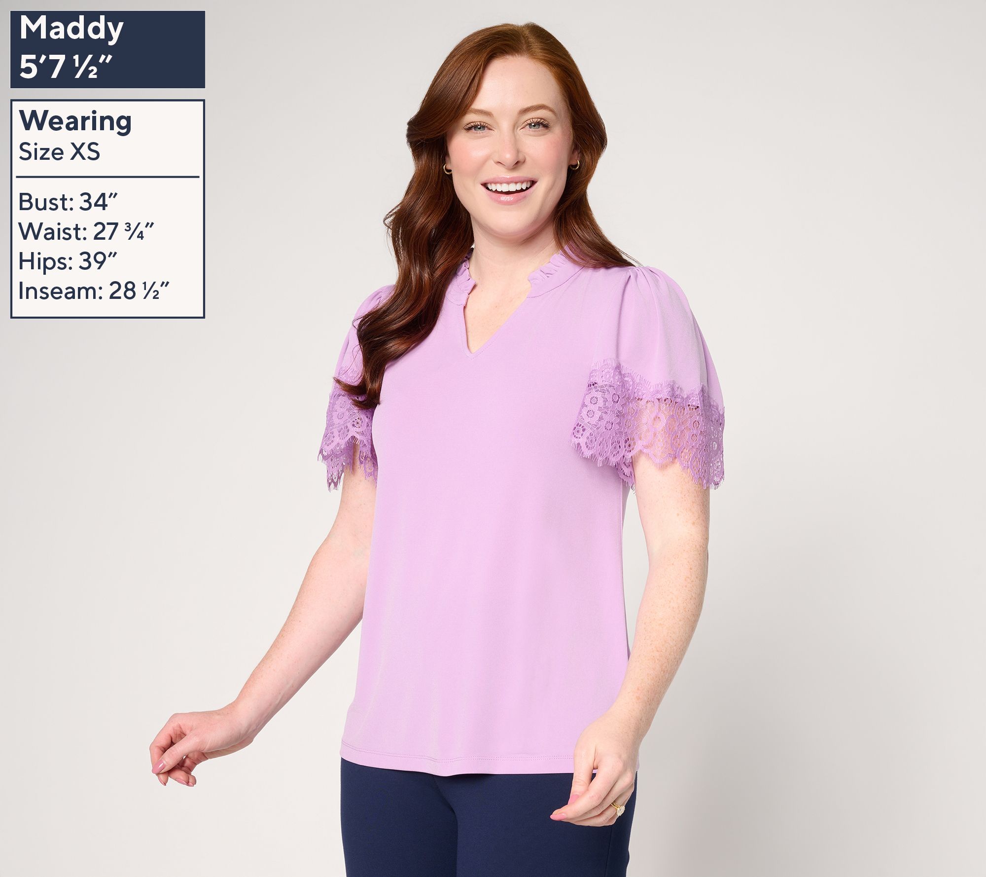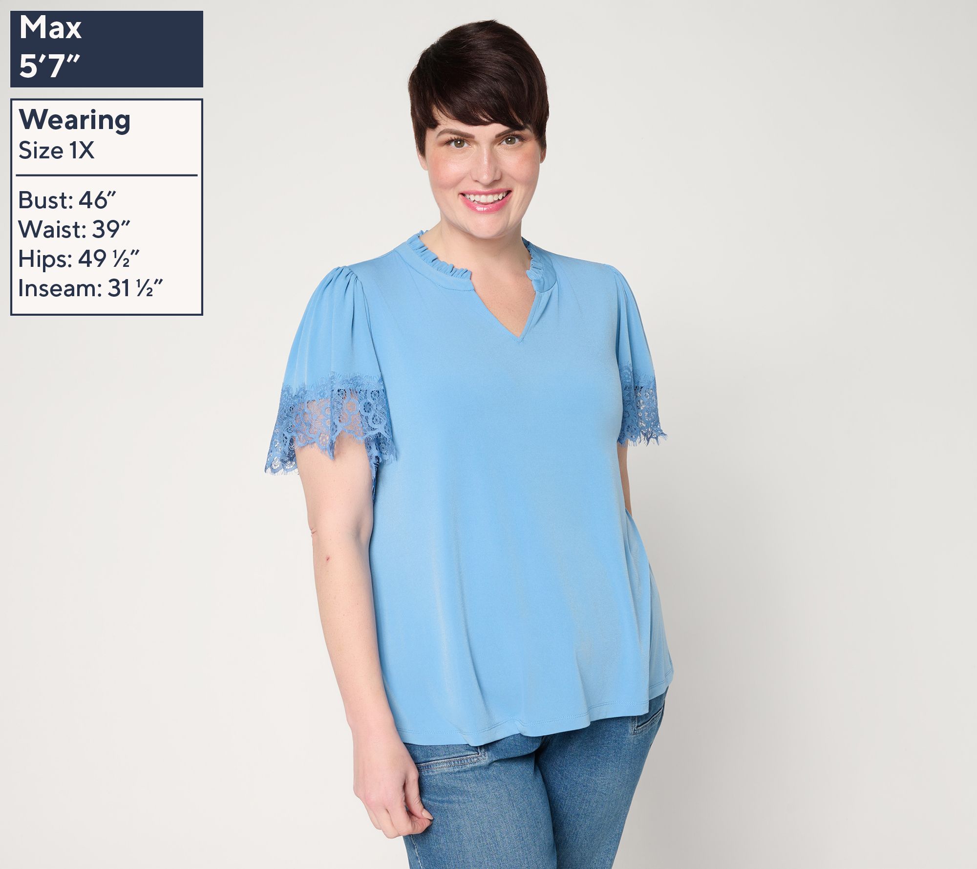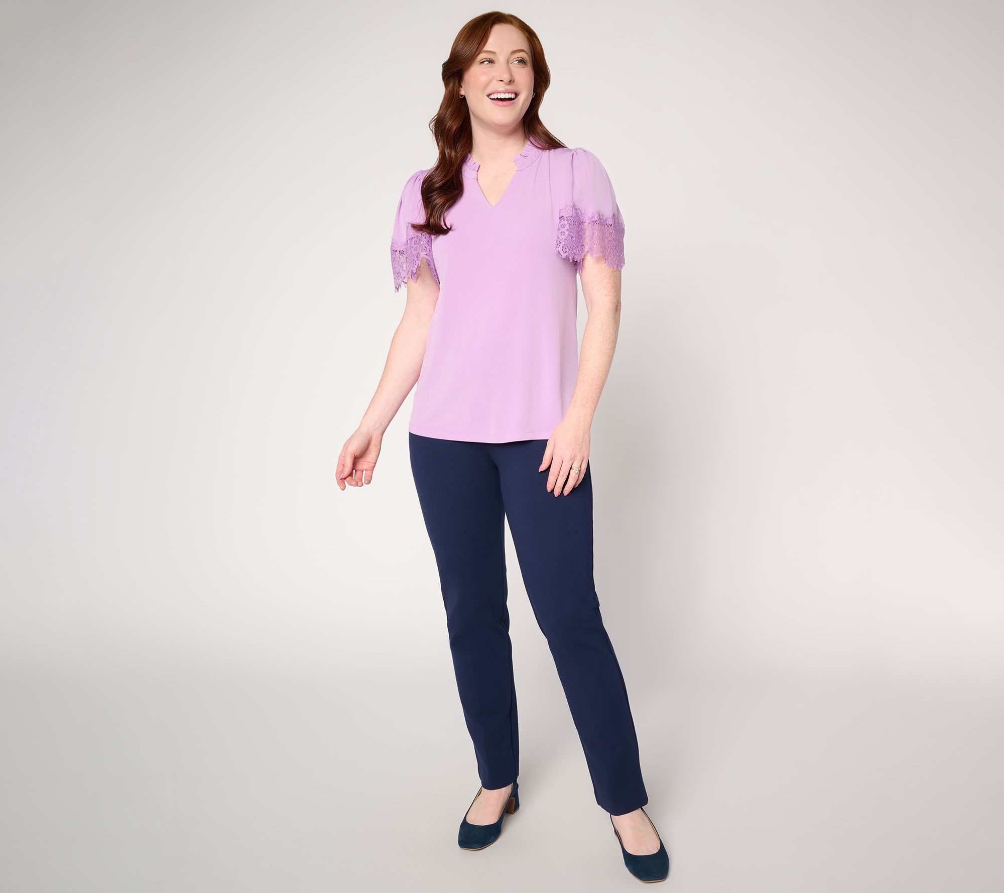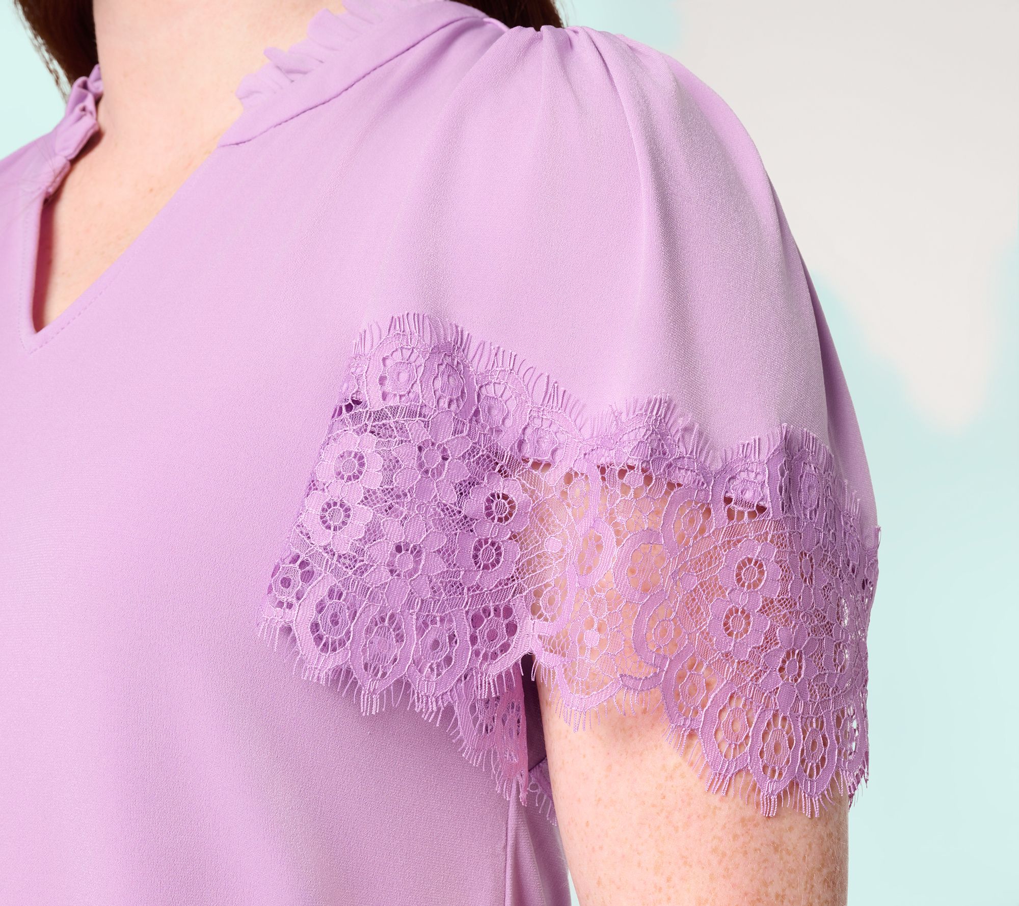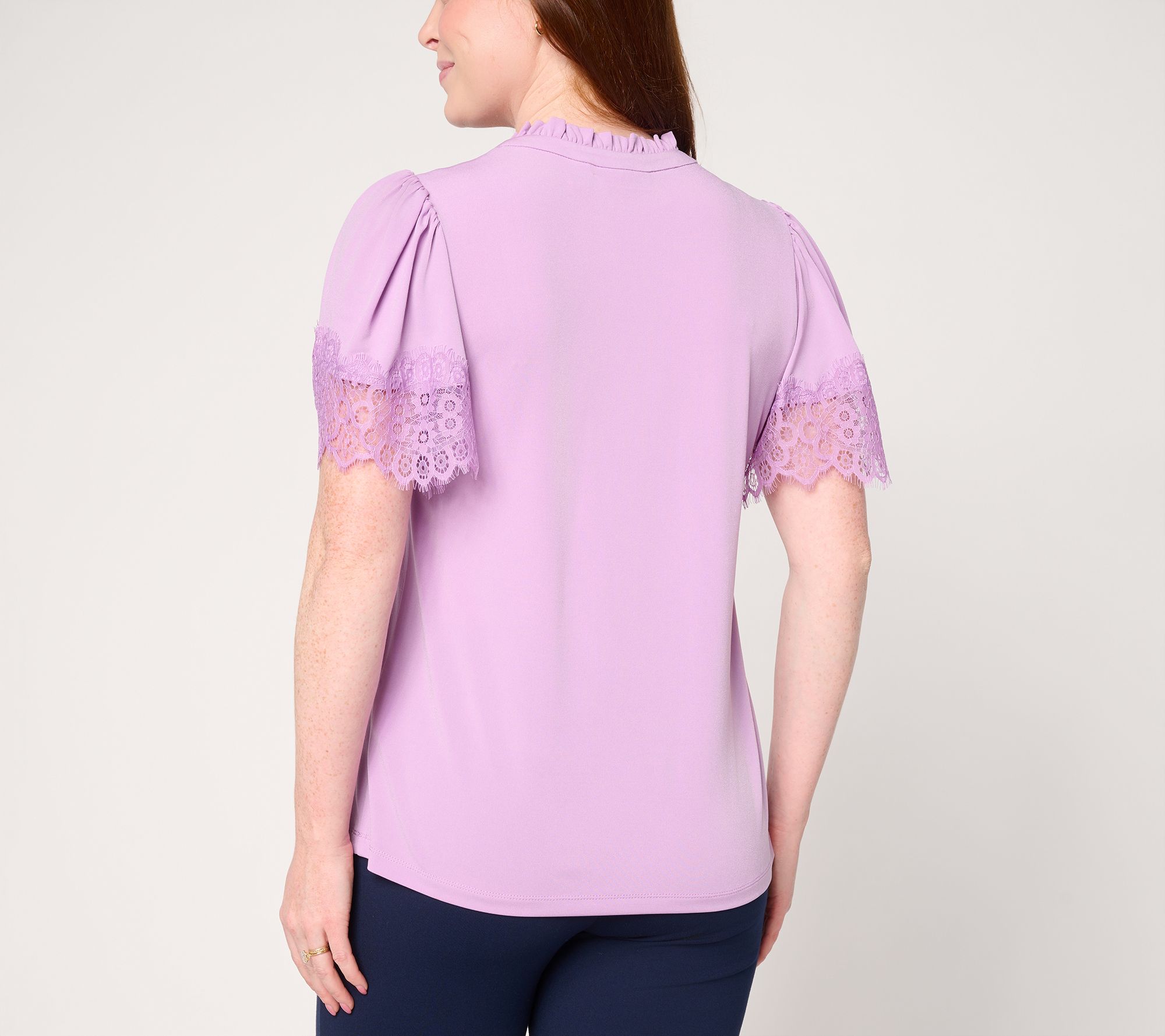 Whether heading to lunch with friends or enjoying a sunny weekend stroll, this knit blouse brings a touch of elegance with delicate lace-trimmed flutter sleeves and a playful ruffle at the collar. Its soft drape and split-neck design pair effortlessly with your favorite pants or skirt, adding feminine charm to every outing. From Susan Graver.
