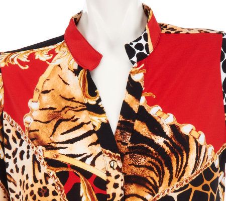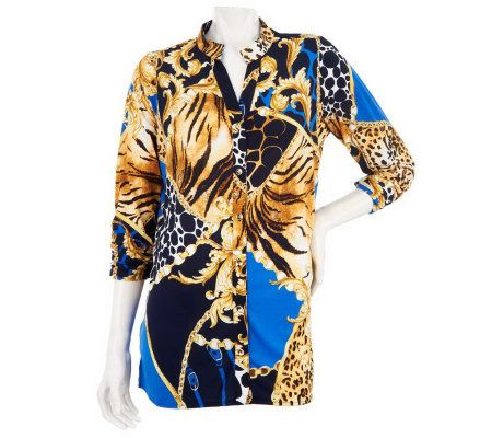 Beautifully bold, this status-print shirt instantly ups the fashion factor of your ensemble. It's just the piece to pair with your favorite solid-colored bottoms. From Susan Graver.