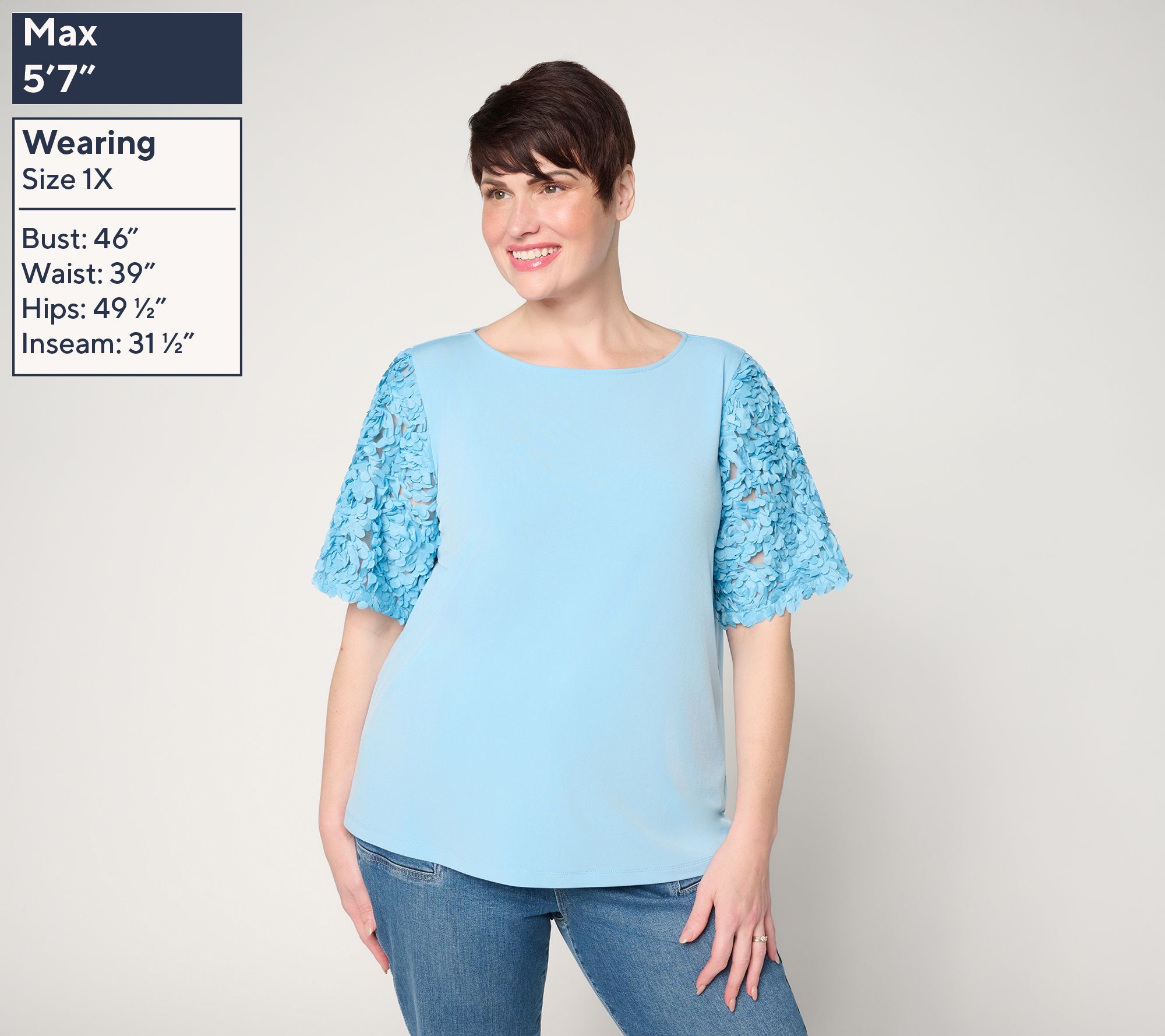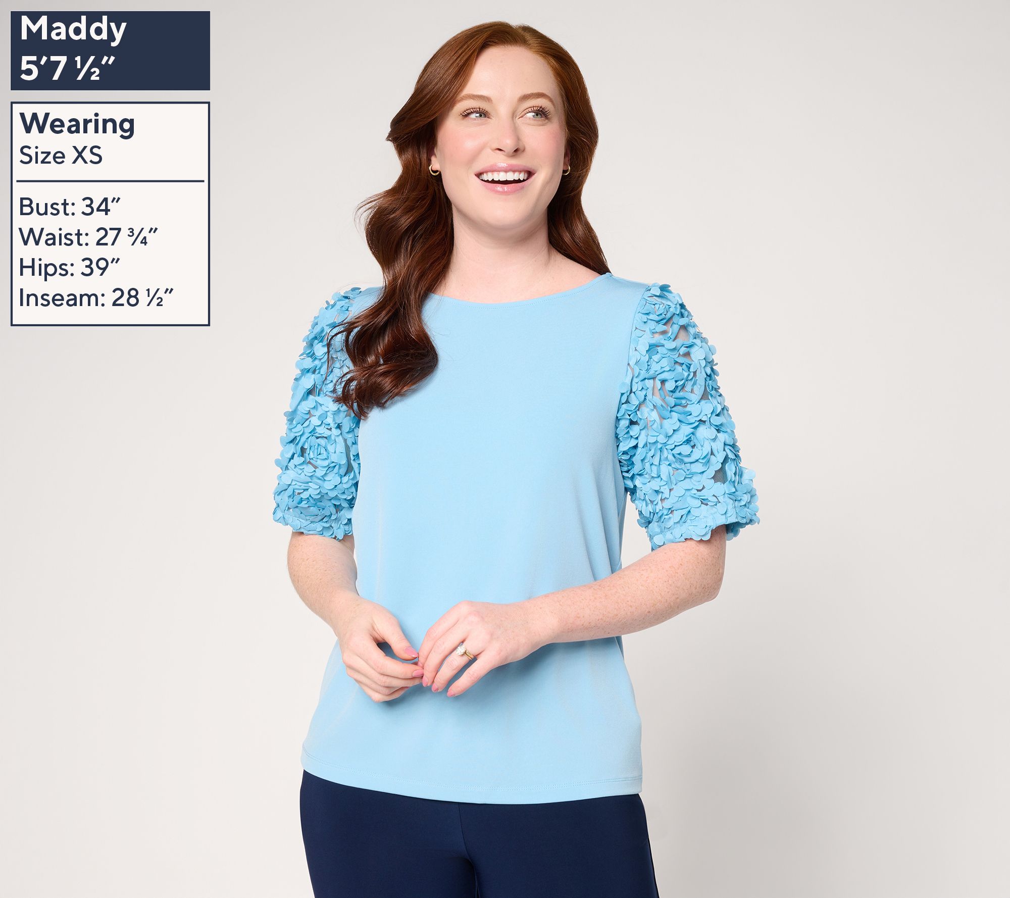 Slip into effortless elegance for daytime gatherings or evenings out with this women's knit top. The pullover design features a bateau neckline and novelty elbow-length sleeves trimmed with delicate mesh detail, bringing a modern twist to a classic silhouette. Style it with tailored pants or denim for a polished finish. From Susan Graver.