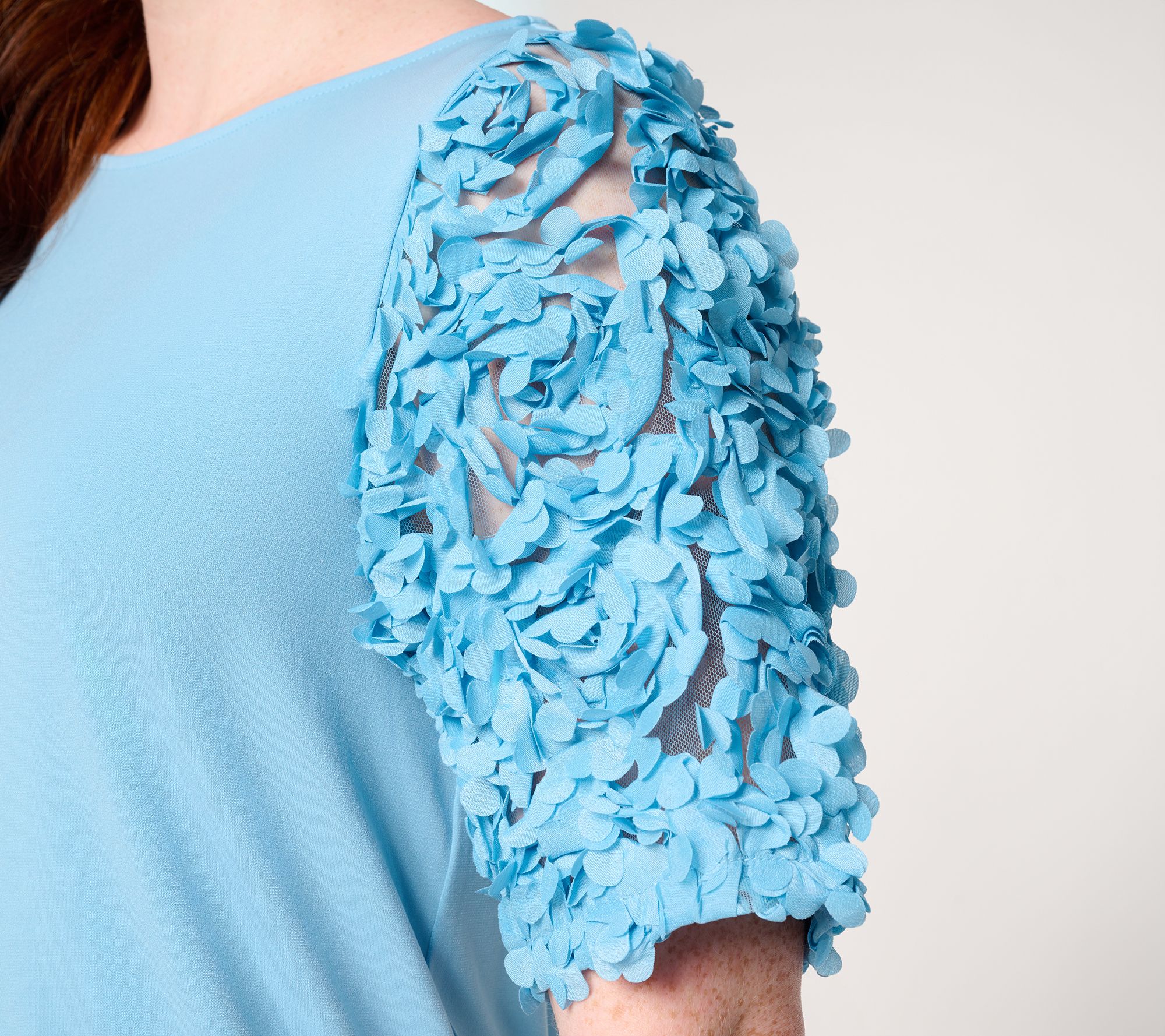 • Fabrication: Liquid Knit® shell: soft, flattering knit with a smooth feel and fluid drape; novelty mesh elbow-length sleeves